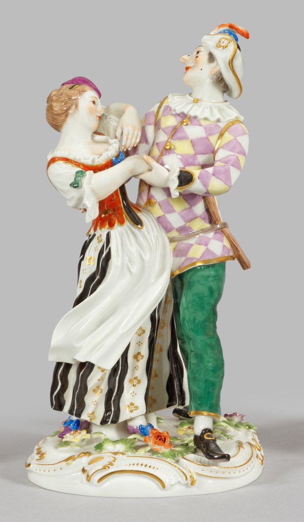 Auf rocaillereliefiertem Sockel stehender Harlekin beim Tanz mit Columbine. Polychrome Malerei mit Goldkonturierung. Entw. Johann Joachim Kaendler. Modell-Nr. 64501. Minim. best.; Schwertermarke. H. 19 cm.