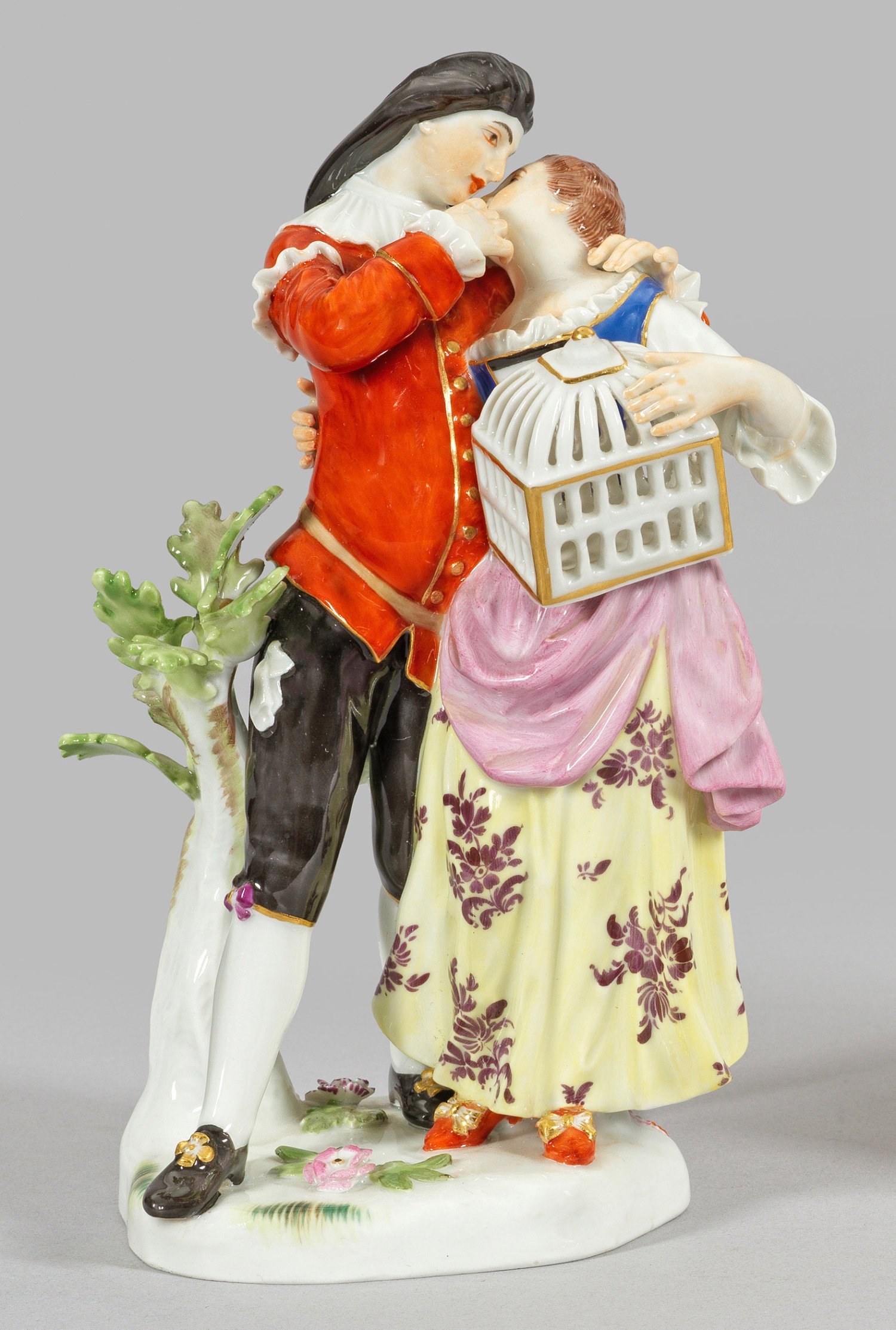 Auf unregelmäßigem, mit plastischen Blütenranken und Blättern belegtem Sockel stehender Scaramuz. Dicht daneben die sich anschmiegende, ihn umarmende, junge Columbine, unter ihrem linken Arm einen Vogelbauer haltend. Polychrome Malerei mit Goldakzenten. Entw. Johann Joachim Kaendler. Modell-Nr. 64504. Best.; rest.; Schwertermarke. H. 18 cm.