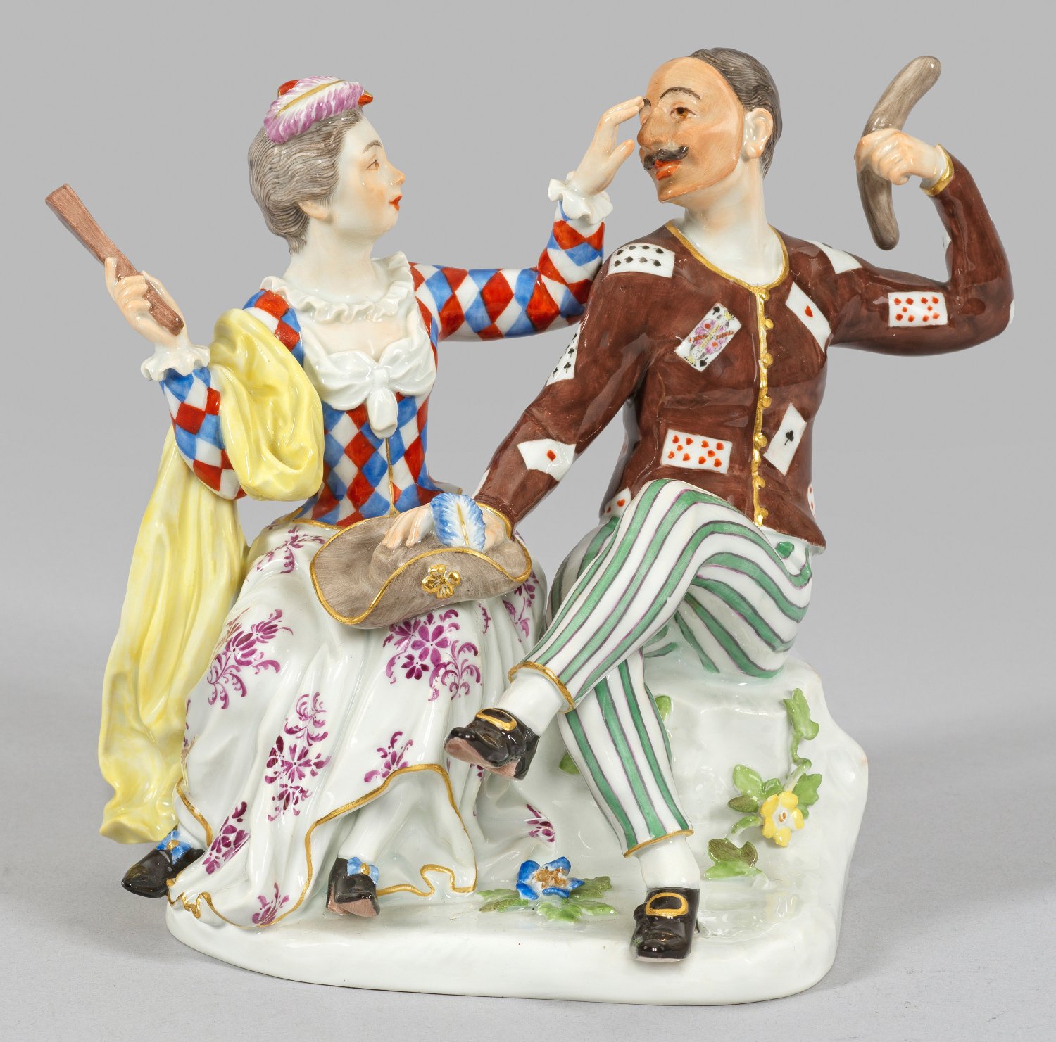 Auf einem mit plastischen Blüten und Blättern belegten Sockel nebeneinander sitzendes Paar, Columbine in geblümtem Rock und rautengemustertem Mieder mit Federhut und Harlekin in grün weiß gestreifter Hose und brauner Jacke mit Spielkartenmuster. Die Komödiantin in der erhobenen, rechten Hand eine Pritsche haltend und mit der Linken nach der Maske des Harlekins greifend. Harlekin in der rechten Hand einen Hut, in der erhobenen Linken eine Wurst haltend. Polychrome Malerei mit Goldkonturierung. Entw. Johann Joachim Kaendler. Modell-Nr. 64515. Schwertermarke. H. 15,5 cm.