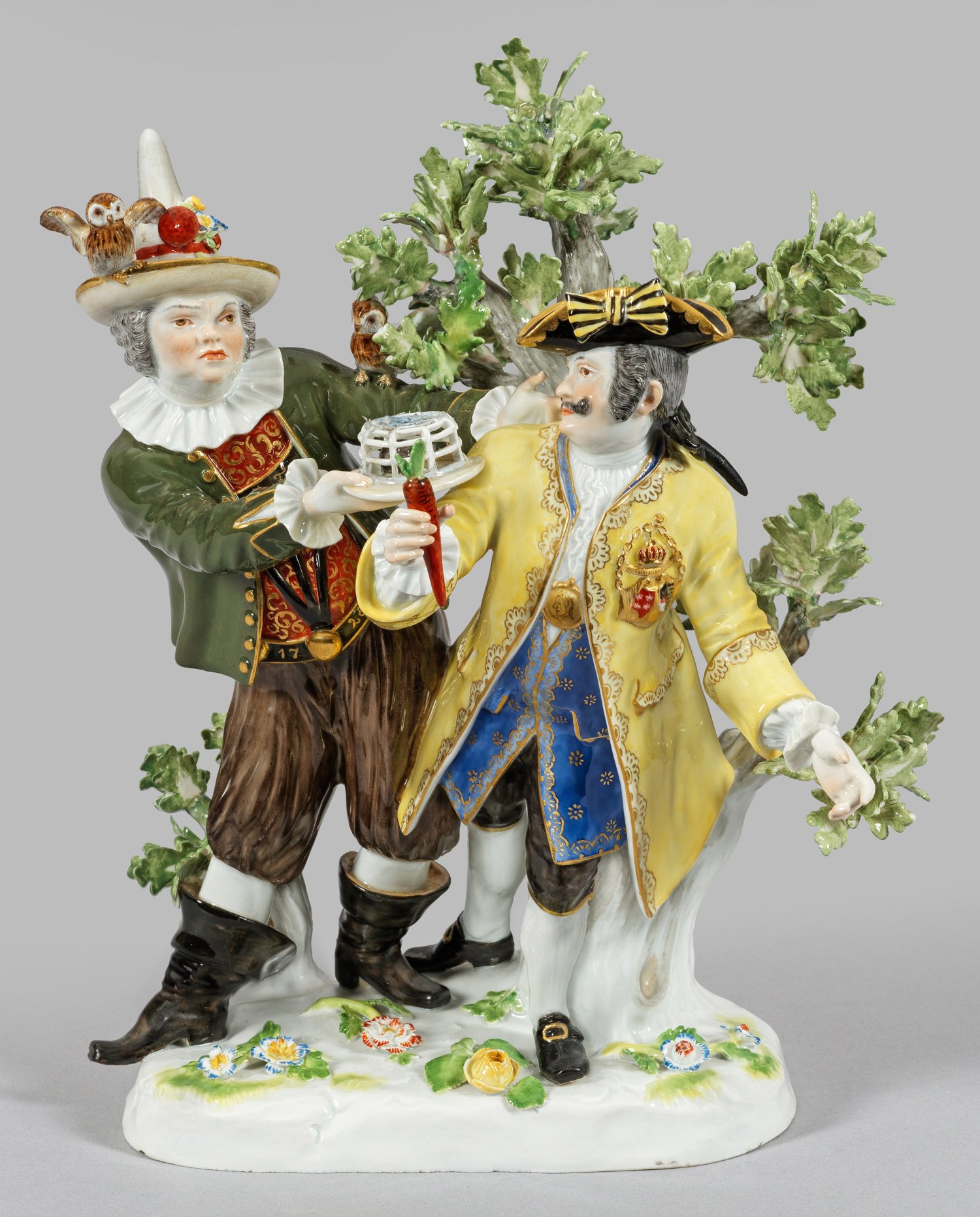 Auf ovalem mit plastischen Blüten und Blättern belegtem Sockel vor einem Baum stehender Hofnarr Joseph Fröhlich in Tiroler Tracht mit Spitzhut und Stulpenstiefeln sowie zwei Eulen, auf seinem Hut und Arm sitzend, Gottfried Schmiedel in Uniform eines Postmeisters, in der rechten Hand einen Rettich haltend, die mit der Mäusefalle gefangene Maus darbietend. Polychrome Malerei mit Goldstaffage. Entw. Johann Joachim Kaendler. Modell-Nr. 290x. Minim. best./rest.; Schwertermarke. H. 26 cm.