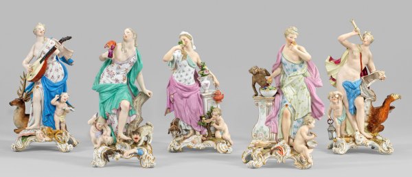 5-tlg.; Auf rocaillereliefierten Sockeln stehende junge Frauen in antikisierenden Gewändern, begleitet von Putten bzw. Tieren sowie mit Beifügung verschiedener Attribute. Die Laute spielende Personifikation des Gehörs mit Notenblättern und Waldhorn, flankiert von einem liegenden Hirsch bzw. des Sehens mit Fernrohr, Spiegel, Brille und begleitendem Adler. Die Personifikation des Geschmacks mit Äpfeln und Trauben, flankiert von einem Affen, der sich aus einer gefüllten Obstschale bedient bzw. gelehnt an eine Säule die stehende Personifikation des Geruchs mit Rosenstrauch und -blüten sowie einem Potpourrigefäß und die Allegorie des Gefühls mit Papagei, Puttenpaar und Hund. Polychrome Malerei mit reicher Goldstaffage. Entw. Johann Friedrich Eberlein. Modell-Nr. 1035, 1042, 1051, 1062, 1136. Unw. rest und best.; Teilw. Brandrisse. Schwertermarke. H. 27 cm - 28 cm.