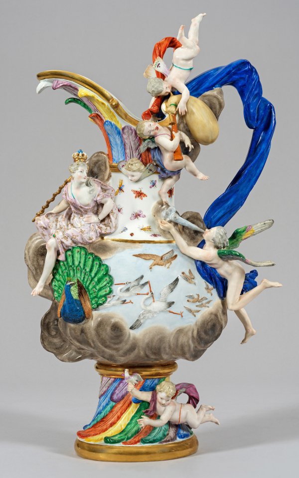 in Form einer Schenkkanne. Über ovalem Fuß bauchiger Korpus mit abgesetztem, eingezogenem Hals und reliefiertem, weit ausschwingendem Ausguss. Seitlich tuchförmiger, drapierter, königsblau staffierter Henkel. Schauseitg stark reliefierter, teilw. vollplastisch modellierter Dekor aus verschiedenen mythologischen Figuren und Elementen, die Luft symbolisierend. Ausguss und Fuß umzogen von Federreliefs. Zwischen reliefplastischen Wolken fliegende Kraniche, Enten und Adler sowie vollplastische Putten mit Taube bzw. Dudelsack. Seitlich sitzende, bekrönte Göttin Juno mit Zepter in antikisierendem, rosafarbenem, von Goldblüten gemustertem Gewand, begleitet von einem Pfau als ihr Attribut. Am Kannenhals Insekten und Schmetterlinge auf weißem Fond. Feine polychrome Malerei mit Goldrand. Entw. Johann Joachim Kaendler, um 1741 - 1742. Modell-Nr. 327. Rest.; Minim. best.; Schwertermarke. H. 64,5 cm.