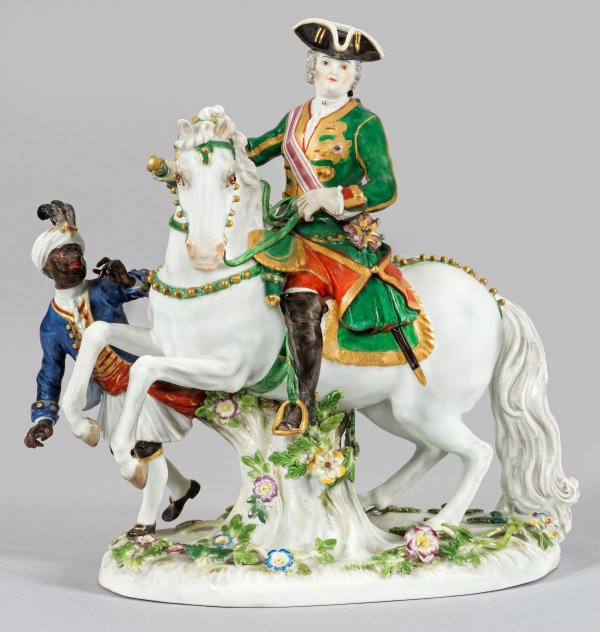 Ovaler, mit plastischen Blütenranken belegter Sockel. Auf einem Schimmel im Herrensitz reitende Zarin in Uniform eines Obersten des Preobraschenski-Garderegiments mit Großkreuz des Andreas-Ordens. An ihrer Seite ein Page mit Turban. Polychrome Malerei mit reicher, teilw. radierter Goldstaffage. Entw. Johann Joachim Kaendler. Modell-Nr. 1059. Rest.; Minim. best.; Schwertermarke. H. 23,5 cm.