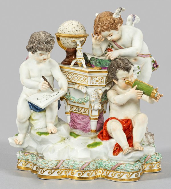 Frontseitig passig geschweifter Sockel mit reliefierter Wellenband- und Eichenblattbordüre. Über felsigem Terrain um einen prächtigen Tisch mit Himmelsglobus komponierte Gruppe von drei Amoretten beim Lesen, Beobachten mit dem Fernrohr und Zeichnen von Sternenbildern. Polychrome Malerei mit Goldstaffage. Entw. Michel Victor Acier. Modell-Nr. 9. Unw. rest.; Schwertermarke. H. 19,5 cm.