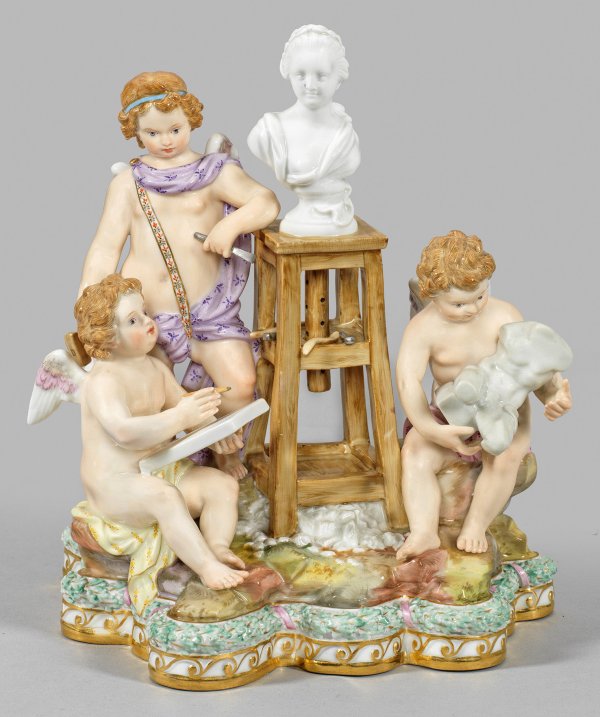 Frontseitig passig geschweifter Sockel mit reliefierten Wellenband- und Eichenblattbordüren. Über felsigem Terrain komponierte Gruppe aus drei Amoretten mit Hammer und Meißel, Zeichenstift und Skizzentafel bzw. mit dem sog. Torso von Belvedere, sich als Bildhauer präsentierend. Mittig stehender Bildhauerbock mit Werkzeug und Büste der lorbeerbekränzten Zarin Katharina II. von Russland. Polychrome Malerei mit reicher Goldstaffage. Entw. Michel Victor Acier. Modell-Nr. 4. Schwertermarke. H. 20 cm.