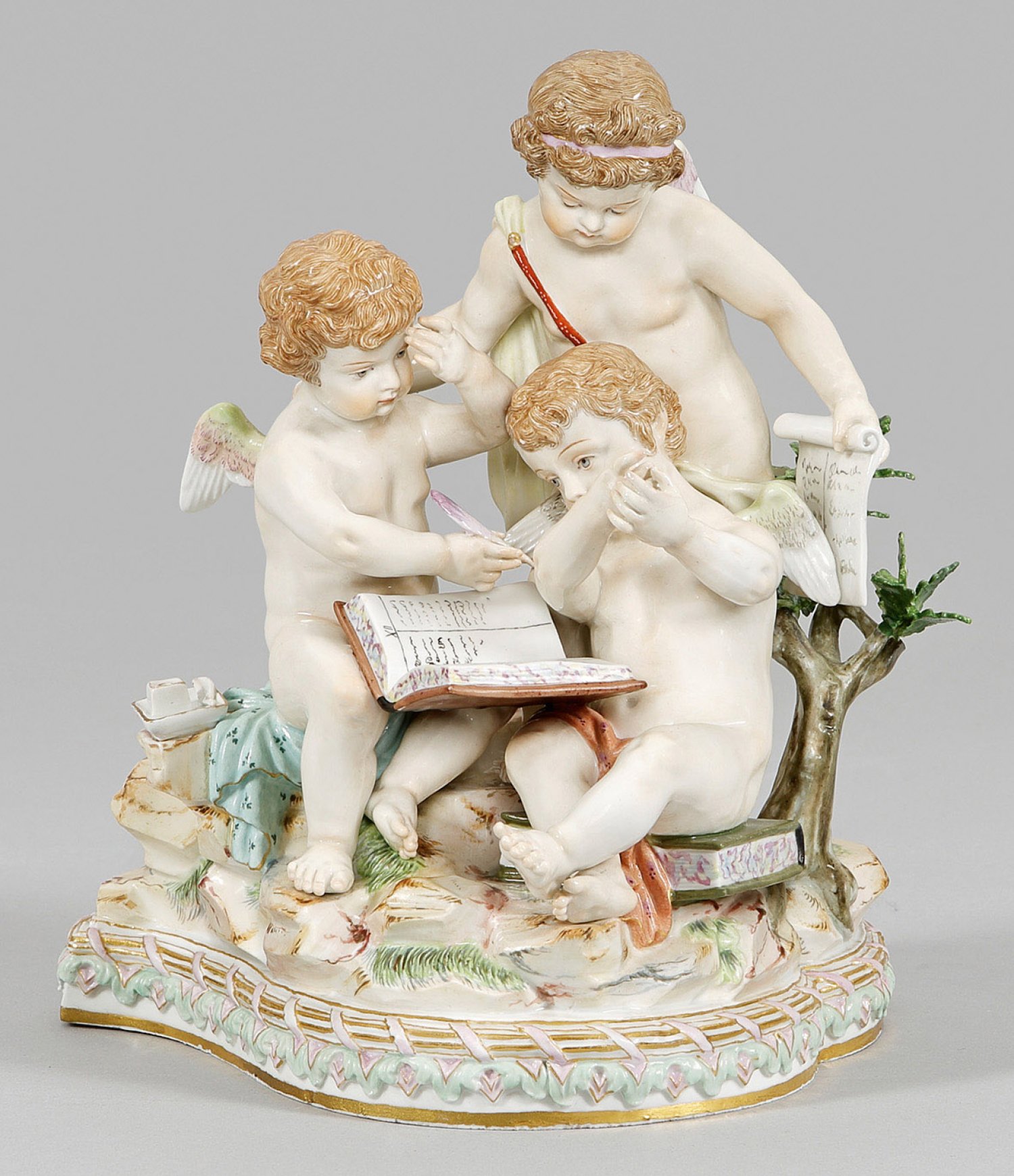 Passig geschweifter Sockel mit reliefierten Ornamentbordüren. Über felsigem Terrain komponierte Amorettengruppe beim Grübeln über ein Problem. Zwei sitzende Amoretten mit aufgeschlagenem Buch bzw. Tintenfass und Schreibfeder. Rückseitig stehender, weiterer Putto mit ausgerollter Schriftrolle. Polychrome Malerei mit Goldkonturierung. Entw. Michel Victor Acier. Modell-Nr. 12. Minim. rest.; Schwertermarke. H. 21 cm. 18 cm x 12 cm.