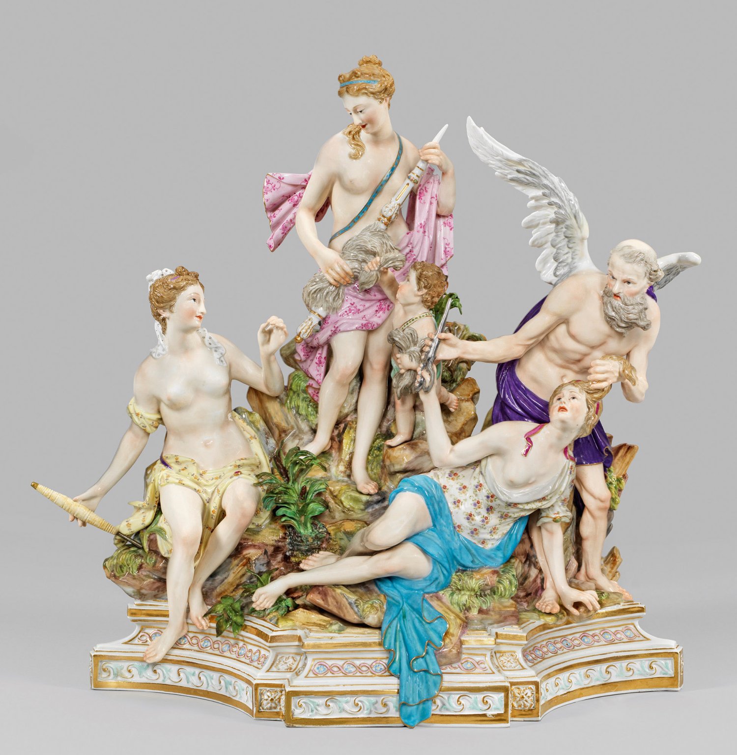 2-tlg., verschraubt. In der Front architektonischer, verkröpfter Sockel mit reliefierten Ornamentfriesen. Über Felsterrain komponierte Gruppe der drei römischen Schicksalsgöttinnen, der sog. Parzen. Mittig erhöht stehende, von einem Putto mit Wollbündel begleitete Clotho, zusammen mit der links sitzenden Lachesis, die Lebensfäden der Menschen spinnend. Rechts stehender Chronos, der Gott der Zeit, die vor ihm liegende Atropos an den Haaren zurückhaltend, um sie am Abschneiden des Fadens zu hindern. Polychrome Malerei mit reicher Goldstaffage. Entw. Johann Joachim Kaendler, 1774. Modell-Nr. 33. Unw. rest.; Schwertermarke. H. 37 cm. B. 35 cm.
