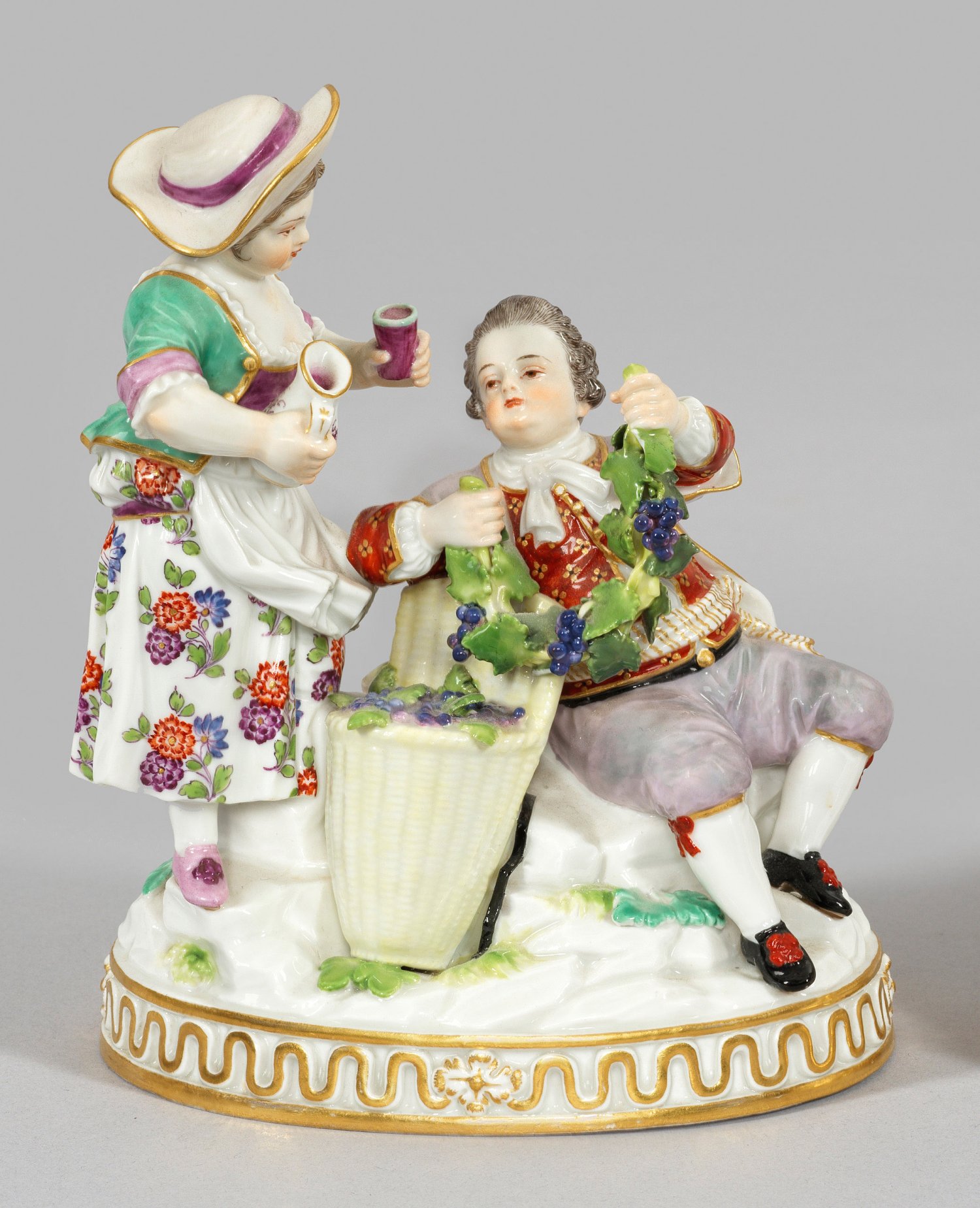 Aus der Serie "Die Jarheszeiten". Auf flachem Felssockel sitzender Knabe, mit beiden Händen eine Girlande aus Weinlaub und Trauben haltend. Nebenstehendes Mädchen mit rundem Hut und wehender Schürze, in den Händen eine Weinkaraffe und ein Becher. Zwischen den beiden eine mit dunklen Trauben gefüllte Kiepe. Polychrome Malerei. Goldkonturierung. Minim. best.; Modell-Nr. F 92. Entw. Michel Victor Acier. Schwertermarke. H. 15 cm.