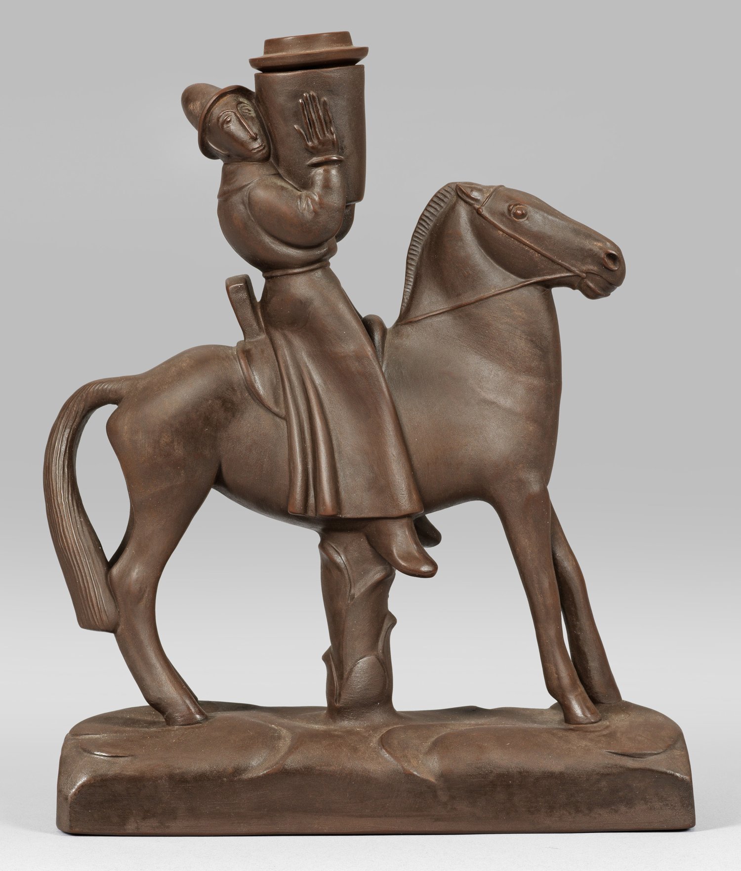 Böttgersteinzeug, partiell poliert. Rechteckssockel. Darauf auf einem Pferd sitzender, nach links gewandter Mann, einen Korb als Kerzentülle mit beiden Händen tragend. Abnehmbarer Einsatz. Entw. Gerhard Marcks, um 1919. Modell-Nr. 85008. Eingepresste Schwertermarke. H. 25 cm.