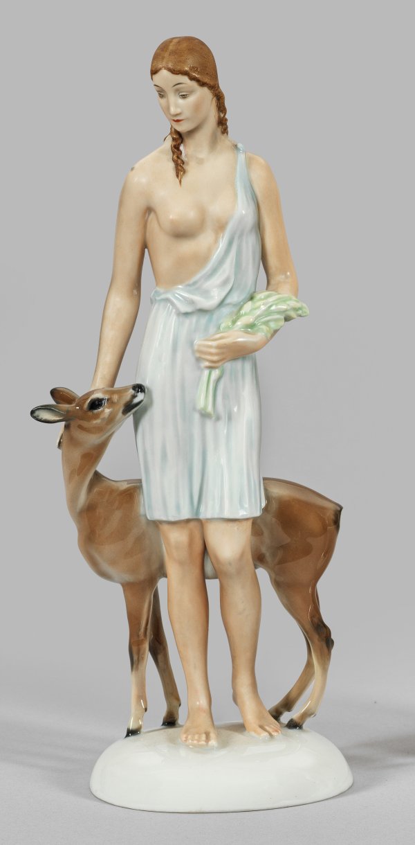 Auf einem aufgewölbten Ovalsockel stehende junge Dame mit entblößter Brust, eine Garbe im Arm haltend, ein ihr zugeneigtes Reh streichelnd. Polychrome Auf- und Unterglasurbemalung. Entw. Gerhard Schliepstein, 1937. Entw. Bez.; Modell-Nr. 1630. Manufakturmarke. H. 30,5 cm.