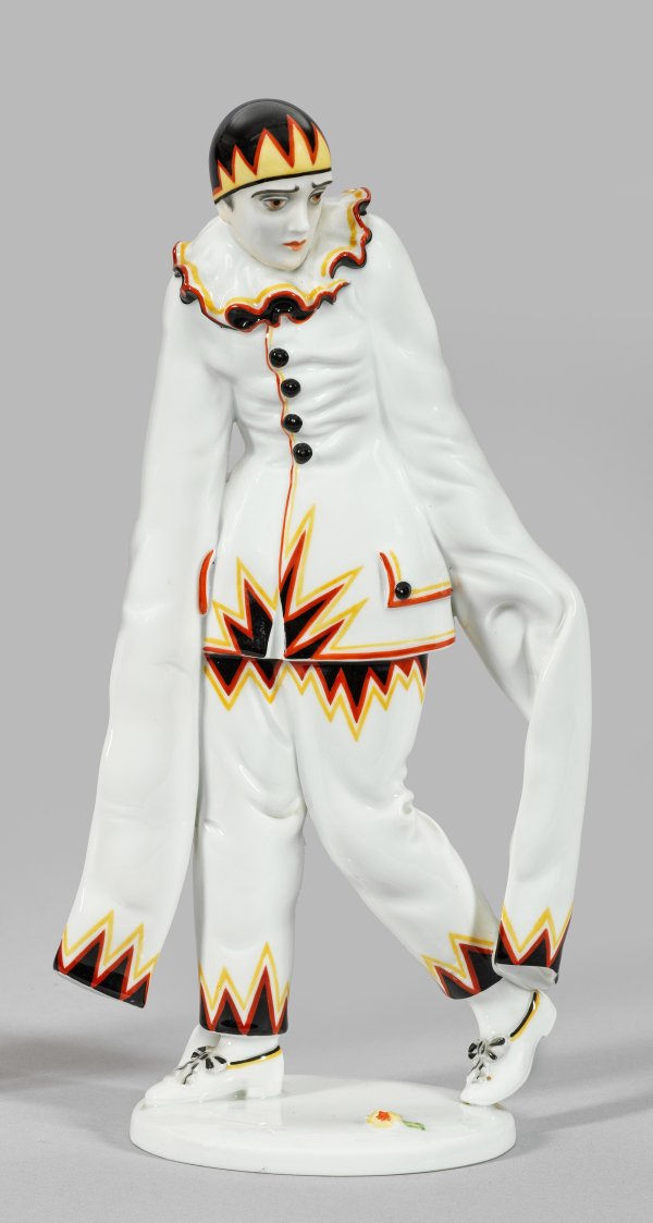 Auf einem Ovalsockel die Darstellung des Tänzers Adolph Bolm als Pierrot. Expressive polychrome Aufglasurbemalung. Entw. Dorothea Charol, um 1923. Modell-Nr. 79. Entw.-Bez.; Manufakturmarke. H. 28,5 cm.