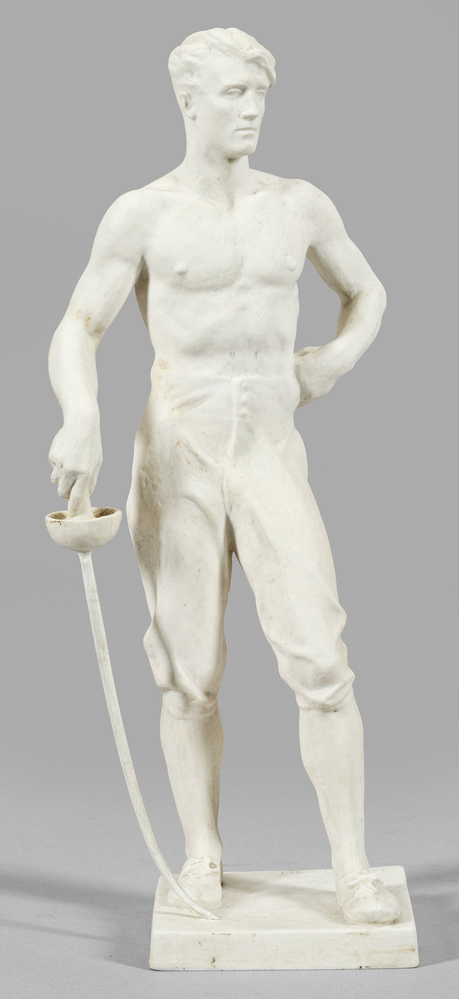 Biskuitporzellan. Weiß. Auf Rechteckssockel stehender, athletischer junger Mann mit Florett, lediglich eine Kniebundhose tragend. Entw. Ottmar Obermaier, um 1938. Entw.-Bez.; Modell-Nr. 83. Minim. rest.; Manufakturmarke. H. 31,5 cm.