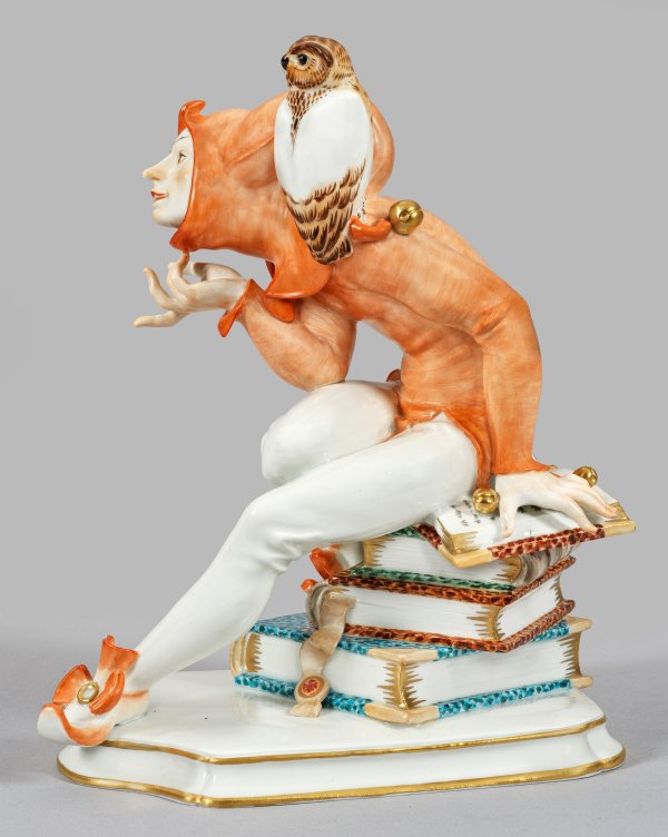 Auf passig geschweiftem, profiliertem Sockel, auf einem Bücherstapel schelmisch sitzender Till Eulenspiegel, im Narrenkostüm mit Goldschellen. Auf seiner linken Schulter sitzende Eule. Polychrome Malerei mit Goldstaffage. Entw. Alexander Struck, 1941. Entw.-Bez. "A. Struck". Modell-Nr. Q 228. Schwerter- sowie Jubiläumsmarke 1710 - 1960. H. 23,5 cm.