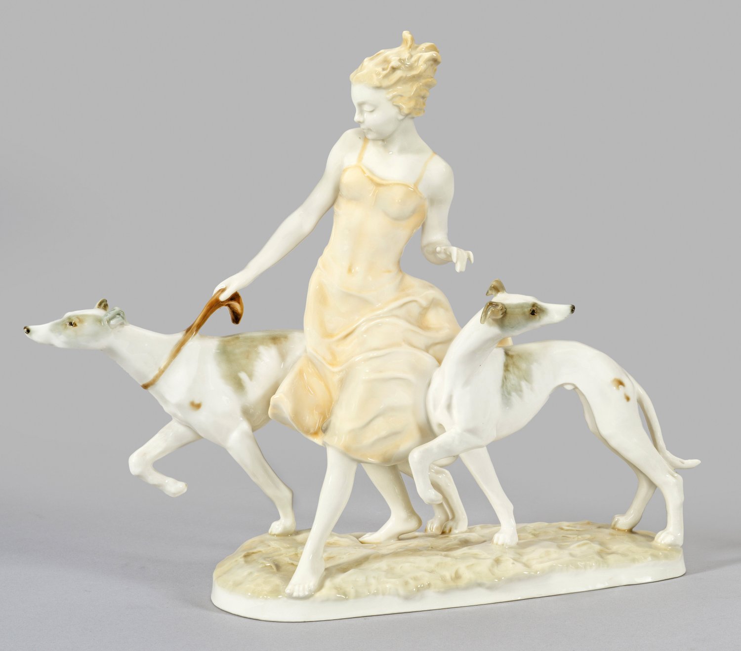 Auf einem unregelmäßig rechteckig abgerundeten Natursockel bewegte Darstellung einer jungen, schreitenden Dame, zwei Windhunde mit sich führend. Polychrome Malerei. Entw. Karl Tutter. Entw.-Bez.; Ger. herstellungsbed. Glasurrisse. Manufakturmarke. H. 31,5 cm. B. 38 cm.