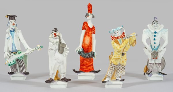 Auf quadratischem, an den Ecken abgeschrägtem Sockel stehender "Clown mit Trommel", "Clown mit Gitarre", "Clown mit Saxophon", "Clown mit Harmonika" und "Clown mit Geige". Polychrome Malerei mit Emailfarben und Poliergold. Entw. Peter Strang, um 1987 - 1989. Entw-Monogr. mit Dat.; Modell-Nr. 60646, 60466, 60463, 60462, 60465. Mit Original-Schatulle. Teilw. minim. best.; Schwertermarke. H. 20 cm - 28 cm.