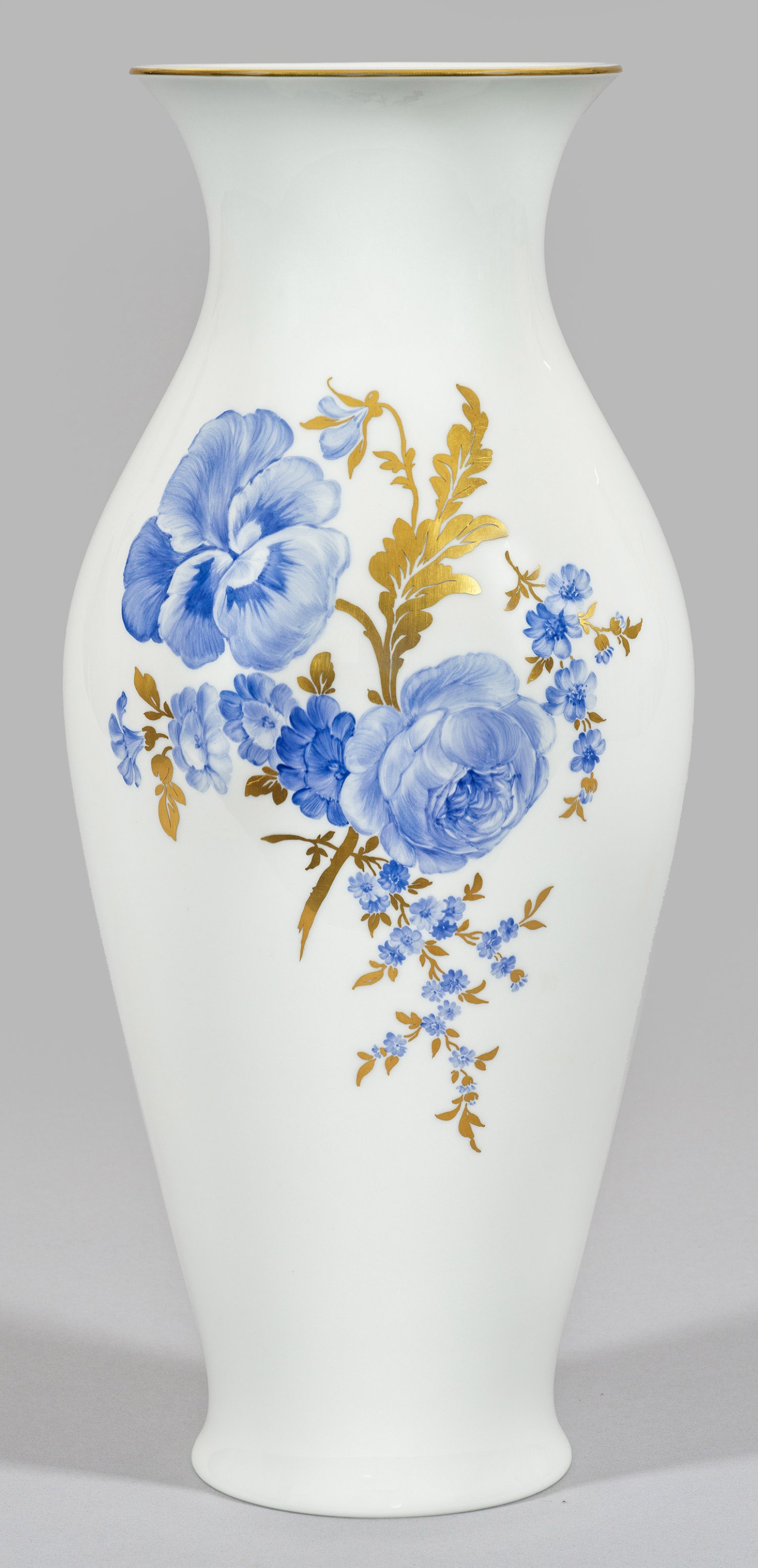 A large porcelain vase painted with flowers in "Bleu Mourant" and gold. Sceptre- and painter's mark.