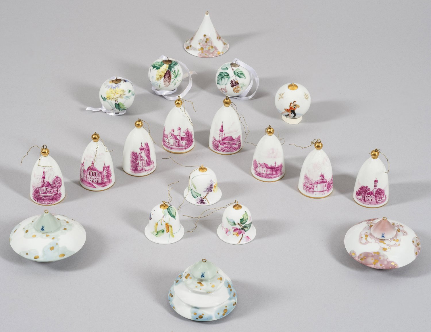 19-tlg.; darunter 12 Glocken, 4 Kugeln und eine stilisierte Tanne. 8 Jahresglocken Nymphenburg (1998 - 2005) mit Kirchen-/Klosteransichten in Purpurcamaieu; 3 Glocken und 3 Kugeln mit polychromer Pflanzen- und Insektenmalerei; Kugel mit Eistänzerpaar und Schneeflocken; Glocke, stilisierter Weihnachtsbaum und 2 diskusförmige Dekoelemente mit marmorierter Musterung in rosa und grün sowie Goldstaffage. Manufaktur-/Schwertermarke. H. 8 cm.