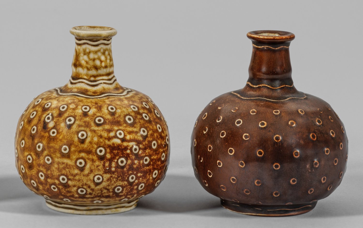 Hellgraues Steinzeug mit hell- und dunkelbrauner, sog. kölnischbrauner Salzglasur. Kürbisform mit kugeligem Korpus, Punkt- und Wellenreliefdekor. Entw. Richard Riemerschmid für seinen Bruder Carl Riemerschmid als Besitzer der Likörfabrik Anton Riemerschmid in München, um 1906-1908; Ausführung Reinhold Merkelbach, Grenzhausen. Pressmarken "Ant. Riemerschmid München.", "-O,5 L". H. 13,5 cm.