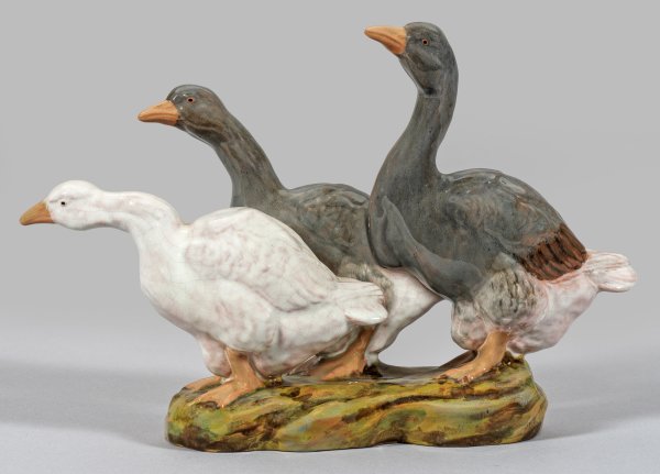 Irdenware. Auf unregelmäßigem Landschaftsockel laufende Gruppe von zwei grauen und einer weißen Gans. Polychrome Bemalung mit verschiedenen Glasuren. Entw. Emil Pottner, 1911. Modell-Nr. 1591. Manufakturmarke und Pressmarke "Made in Germany". H. 21 cm.