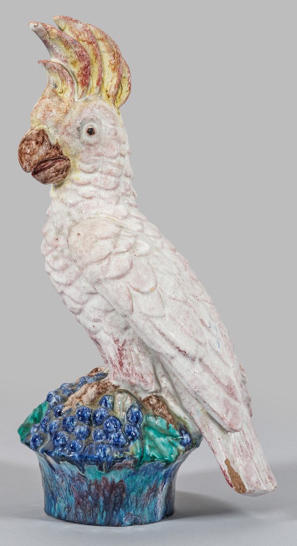 A German glazed earthenware figure of a cockatoo with grapes attributed to Josef Wackerle and the Nymphenburg Manufactory. Minor chips.