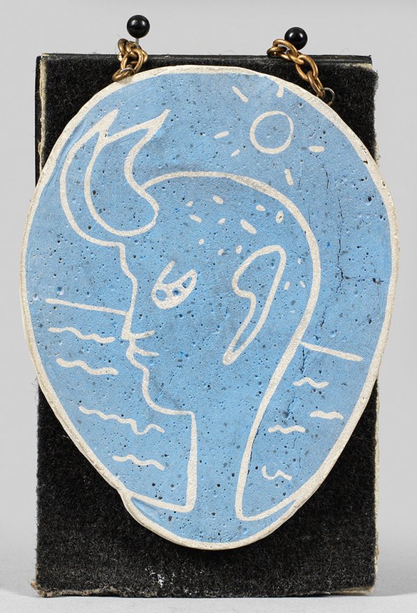 Irdenware, weißer Scherben. Dekor in hellblauer und weißer Engobe. Wvz. Guédras 317. Variante 4 des 1958 von Cocteau entworfenen und 1958/59 in kleiner Serie in der Keramikwerkstatt Madeline-Jolly (von Philippe Madeline und Marie-Madeleine Jolly) in Villefranche-sur-Mer ausgeführten Anhängers. Dieser zeigt ein für Cocteau motiv- und stiltypisches Bildnis vor einem Meer im Sonnenschein. Rücks. schwarze Pinselsign. "Jean Cocteau" mit Stern. Messing-Kettenaufhängung. H. 10,2 cm.