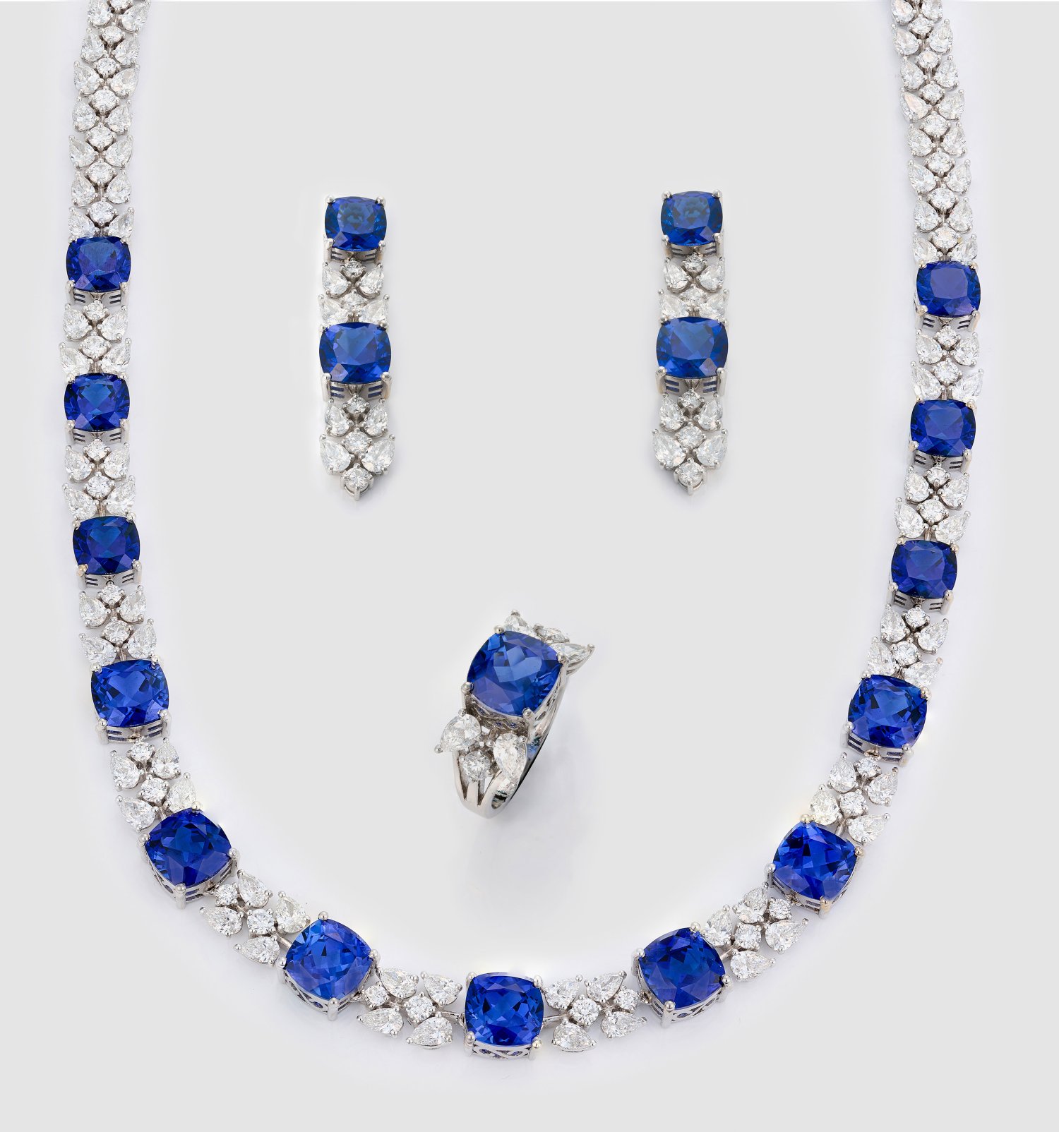 Collier, korrespondierendes Paar Ohrgehänge und Ring. Weißgold, gest. 750. Collier besetzt mit Laboratory Grown Saphiren von zus. ca. 46,30 ct. und Laboratory Grown Diamanten von zus. ca. 24,02 ct. (E-F/vvs-vs) im Pearcut. Paar Ohrgehänge besetzt mit korrespondierenden Saphiren von zus. 14,10 ct. und korrespondierenden Diamanten von zus. 4,24 ct. (E-F/vvs-vs). Ring besetzt mit Laboratory Grown Saphir von zus. ca. 4,10 ct. und Laboratory Grown Diamanten von zus. ca. 1,17 ct. (E-F/vvs-vs) im Pearcut. Ges.-Gew. ca. 79,05 g.
