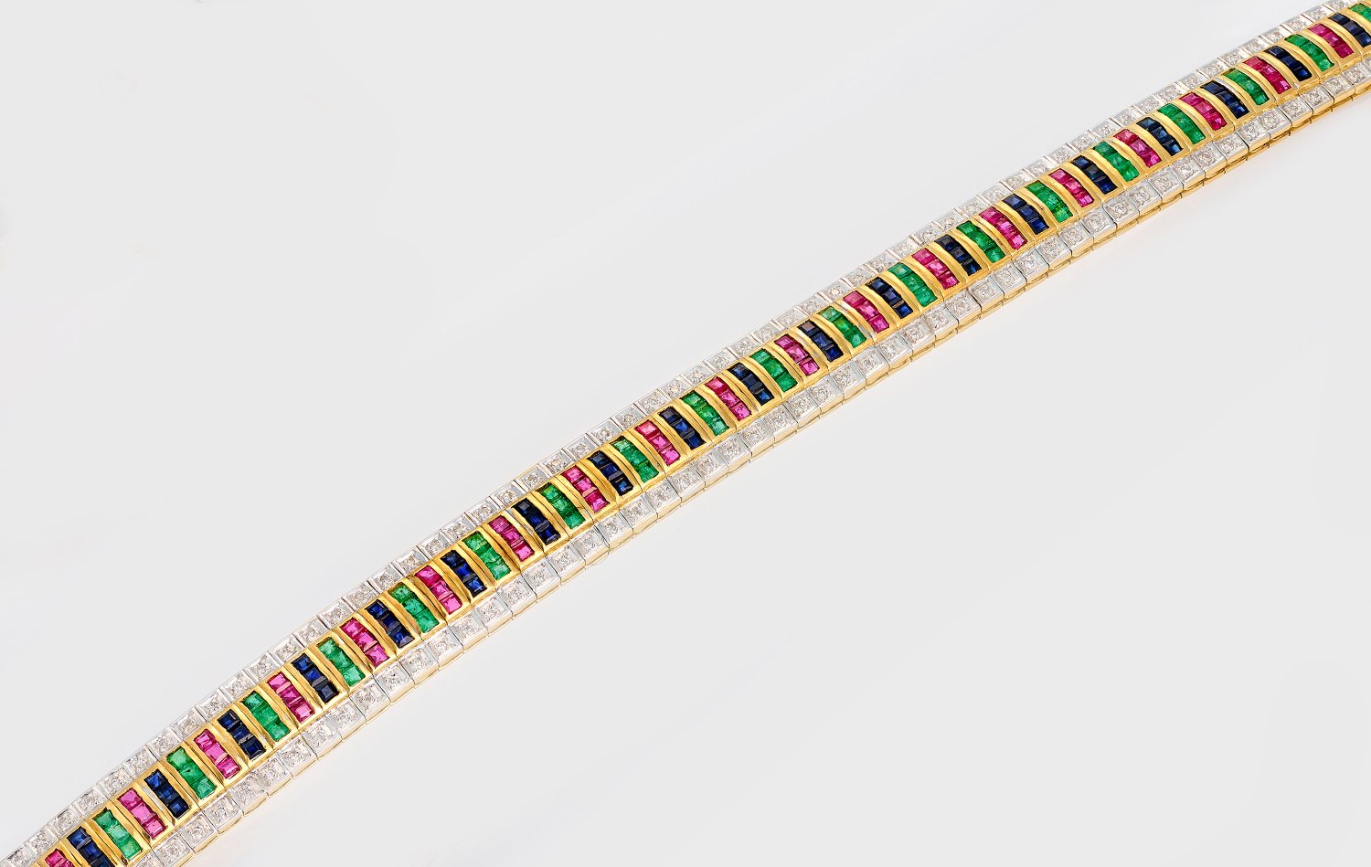 Gelbgold, gest. 585. Schauseitig besetzt mit Smaragden, Saphiren und Rubinen von zus. ca. 7,86 ct. im Carréeschliff, gerahmt von Diamanten von zus. ca. 0,76 ct.; Gew. ca. 34,48 g.