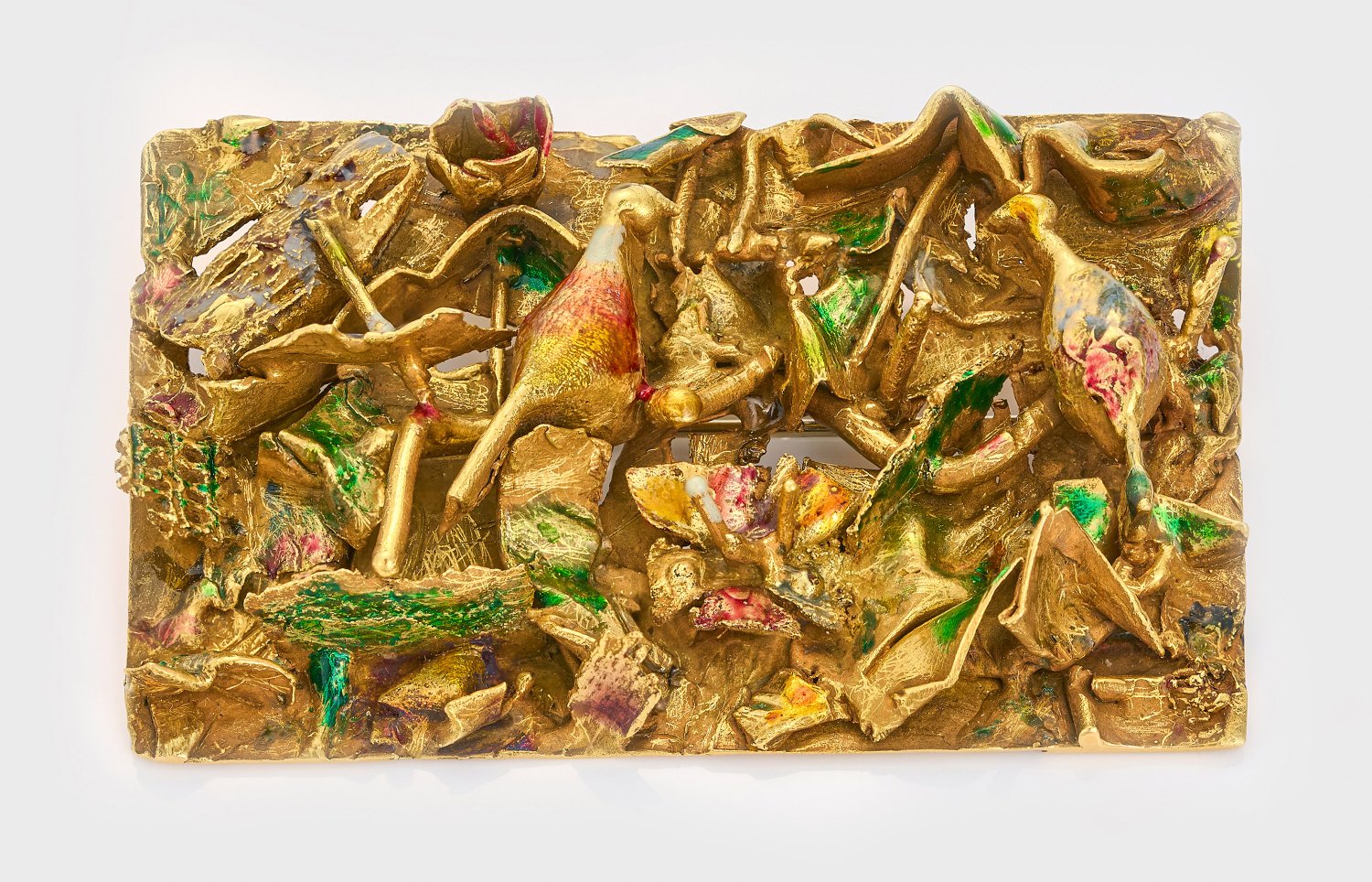 Gelbgold, teilw. farbig emailliert, gest. 750. Plastisch gestaltet in Form eines stilisierten Blütenbaumes mit Vogelpaar. Herstellerzeichen. Gew. ca. 38,78 g.