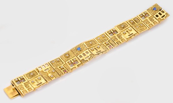 Gelbgold, gest. 750. Breite Bandform aus teils maskenartigen, durchbrochen gearbeiteten Gliedern, besetzt mit Saphiren, Rubinen und Diamanten. Herstellerzeichen. Gew. ca. 58,91 g.