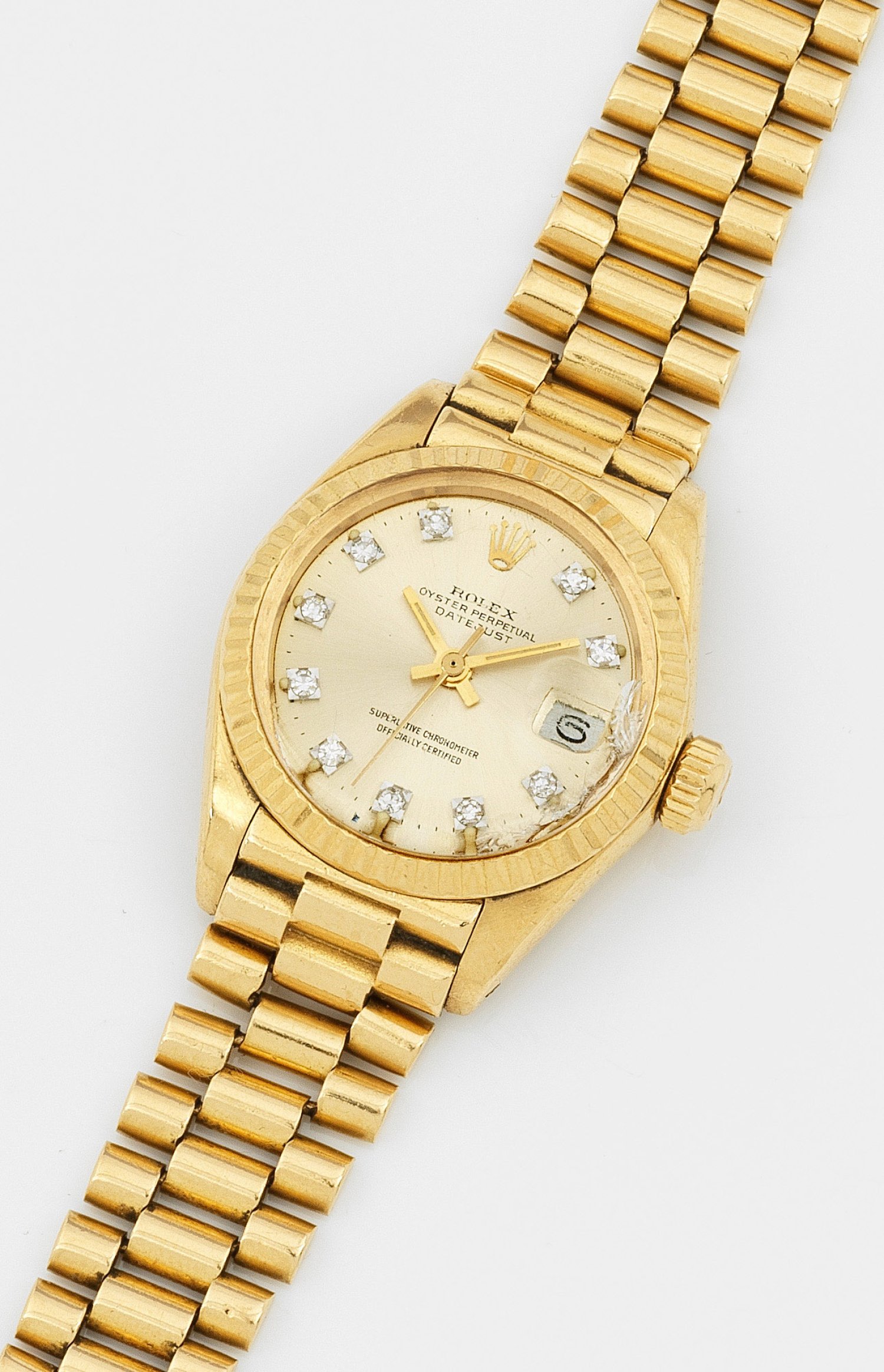 Gelbgold, gest. 750. Rundes Uhrengehäuse, geriffelte Lunette, goldenes Zifferblatt mit Brillantindexen, Stabzeiger mit Tritiumauflage, Plexiglas mit Datumslupe. Präsidentenarmband mit Doppelschließe. Automatikwerk. Ref.-Nr. 6917, 5563475. Herstellerzeichen. Nr. Ref. 6917, 5563475. Gew. ca. 66,59 g.