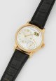 Roségold, gest. 750. Rundes Uhrengehäuse, Silber gekörntes Zifferblatt, römische Zahlen und Indexe, Lanzenzeiger, kleine Sekunde, Gangreserveanzeige und Großdatum, verglaster Boden. Werk, Handaufzug Kaliber L901.0 mit handgraviertem Unruhkloben. Schwarzes, geprägtes Lederarmband mit Lange-Gold-Dornenschließe. Model-Nr. 111.032, Gehäuse-Nr. 137605, Werk-Nr. 30724. Herstellerzeichen. D. 36 mm. Gew. ca. 75,24 g. Garantie-Karte. Nahezu ungetragen.