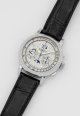 Platin, gest. 950. Rundes Uhrengehäuse, Silber gekörntes Zifferblatt, mit römischen Zahlen und Indexen sowie Lanzenzeiger mit Tritiumauflage, Anzeige von Stunde und Minute über Zeiger aus der Mitte, Kleine Sekunde mit Sekundenstopp zur sekundengenauen Einstellung der Uhrzeit bei 8 Uhr, Großdatum bei 12 Uhr, Drücker zur Datumseinstellung bei 10 Uhr, Wochentagsanzeige in Englisch bei 8 Uhr, Monatsanzeige in Englisch bei 4 Uhr, Mondphasenanzeige bei 6 Uhr, Tag- und Nachtanzeige bei 9 Uhr, Schaltjahranzeige bei 4 Uhr, verglaster Boden. Saphirglas. Werk, Handaufzug Kaliber L952.1 mit handgraviertem Unruhkloben, Chronograph Flyback. Schwarzes, geprägtes Lederarmband mit Lange-Platin-Dornenschließe. Ref.-Nr. 410.025E, Modell-Nr. LS4102AP, Gehäuse-Nr. 163013, Werk-Nr. 48102. Herstellerzeichen. D. 41 mm. Gew. ca. 143,32 g. Fullset: Garantie-Zertifikat von 2024, Garantie-Siegel mit Service Buch und Original Box mit Umkarton.