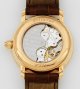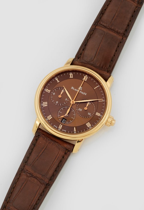 Roségold, gest. 750. Rundes, profiliertes Uhrengehäuse, hellbraunes satiniertes Zifferblatt, römische Zahlen und Lanzenzeiger, Datum, Stunde, Kleine Sekunde und verglaster Boden. Automatikwerk. Braunes, geprägtes Lederarmband mit Blancpain-Gold-Dornenschließe. Herstellerzeichen. Ref.-Nr. 6185-3644-55, Nr. 589. D. 37 mm. Gew. ca. 68,56 g. Original-Garantiekarte.