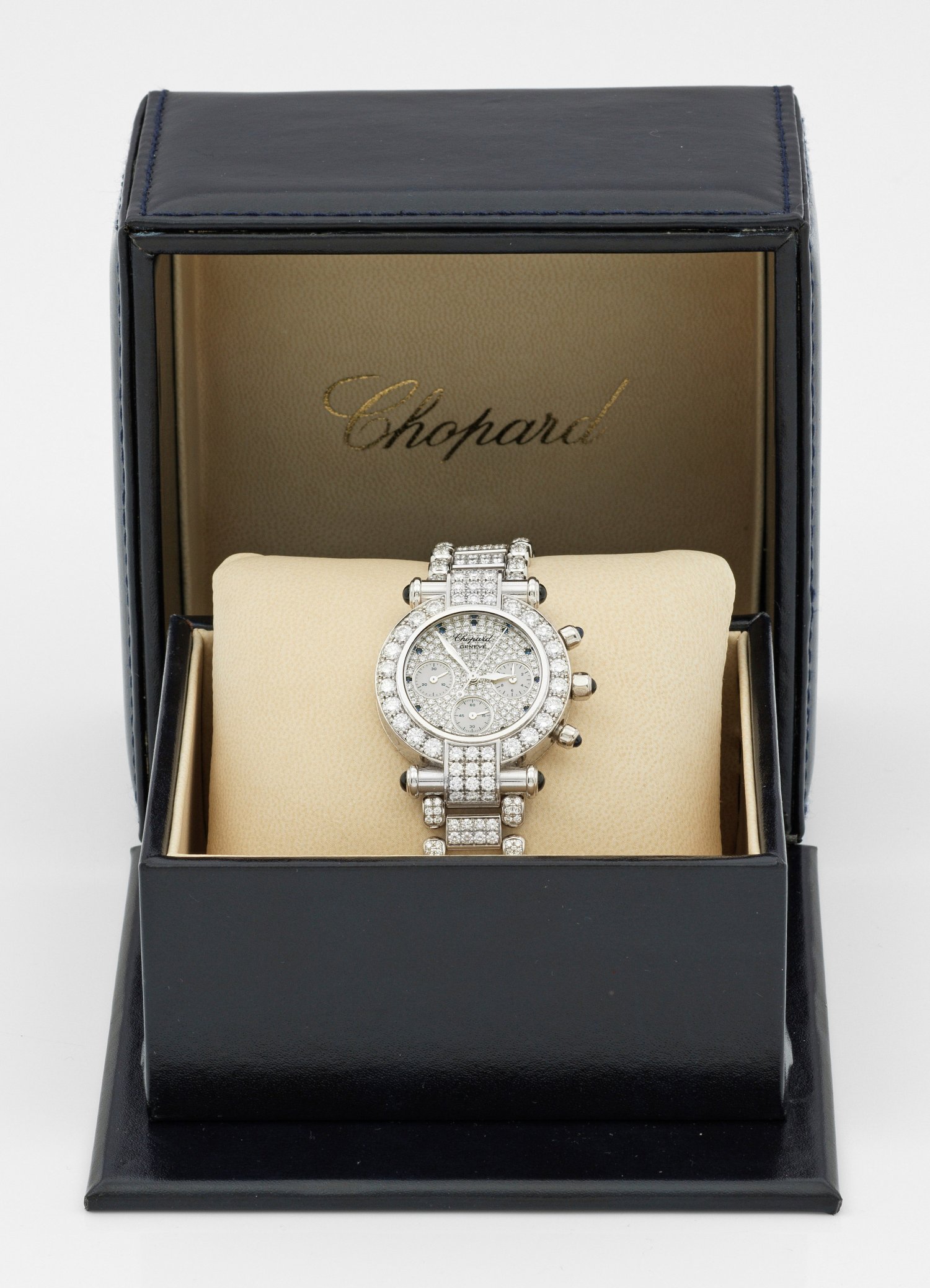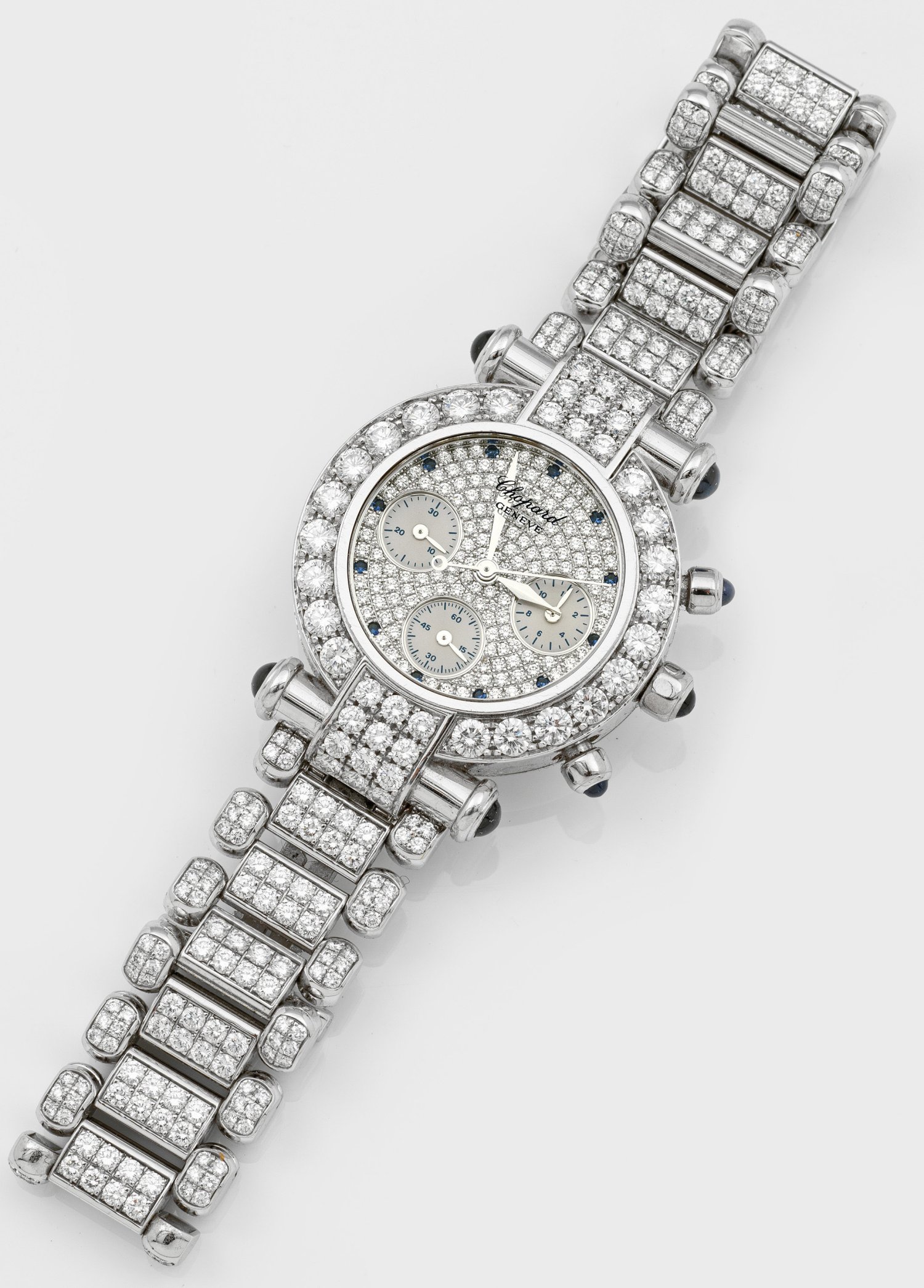 Weißgold, gest. 750. Völlig ausgefasst mit Brillanten von zus. ca. 11,00 ct. (F/vvs), akzentuiert mit Saphiren von zus. ca. 1,76 ct.; Quarzwerk mit Chronograph. Ref.-Nr. 38/3212-23, Serien-Nr. 719225. Herstellerzeichen. Gew. ca. 139,21 g. Original Box. Beiliegend Chopard-Zertifikat.