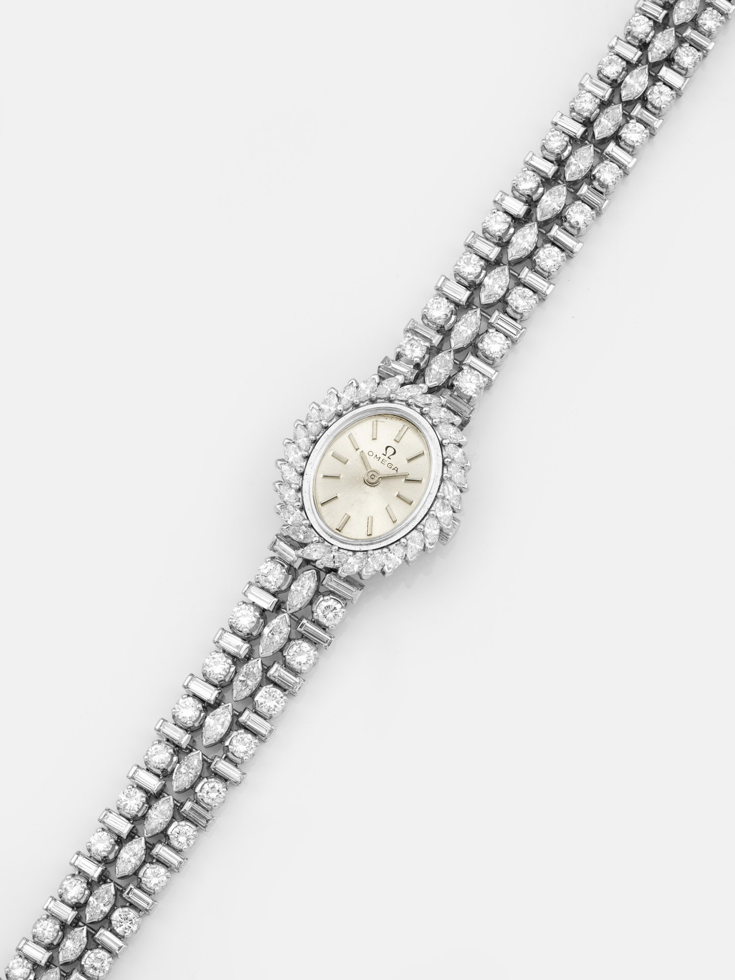 Lady's wristwatch by Omega, set with diamonds approx. 10,00 ct. (G-H/vs-si), mechanical movement, in 18 k white gold.