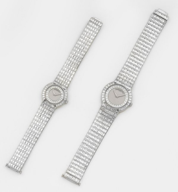 Weißgold, gest. 750. Rundes Uhrengehäuse, fein guillochiertes Zifferblatt, Lanzenzeiger, übergehendes breites Gliederarmband. Völlig ausgefasst mit Diamanten von zus. ca. 22,73 ct. (D-F/vvs) und ca. 25,73 ct. (D-F/vvs), im Emerald- und Baguetteschliff. Mechanisches Werk mit Handaufzug, Kaliber 9-1003/2. Gehäuse-Nr. 665348 und 665347, Modell-Nr. 10546/146G-22, Movement-Nr. 835026/763503. Herstellerzeichen. Ges.-Gew. ca. 219,72 g., einzeln 91,50/128,22 g. Top Zustand, nahezu ungetragen.