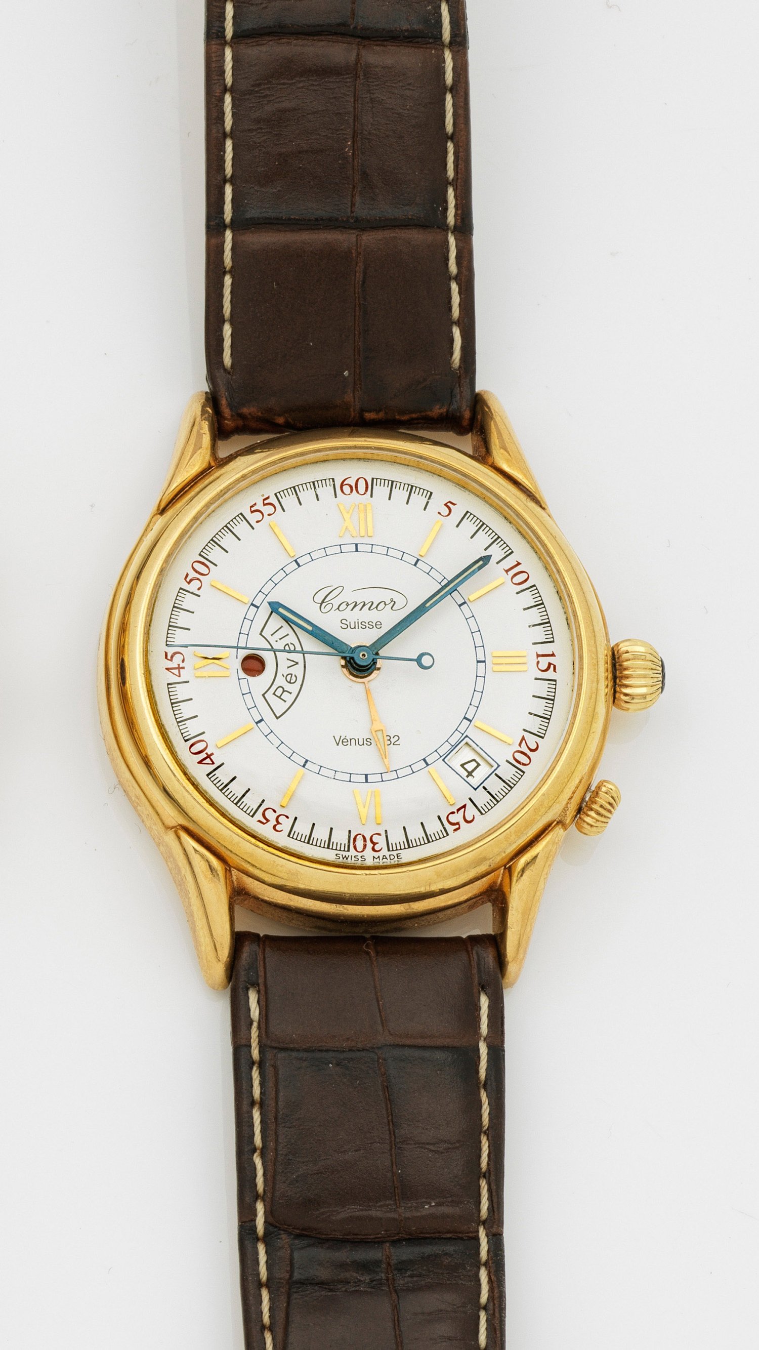 Gentlemen's wristwatch by Comor, mechanical movement with alarm, in steel gilded. Maker's mark.