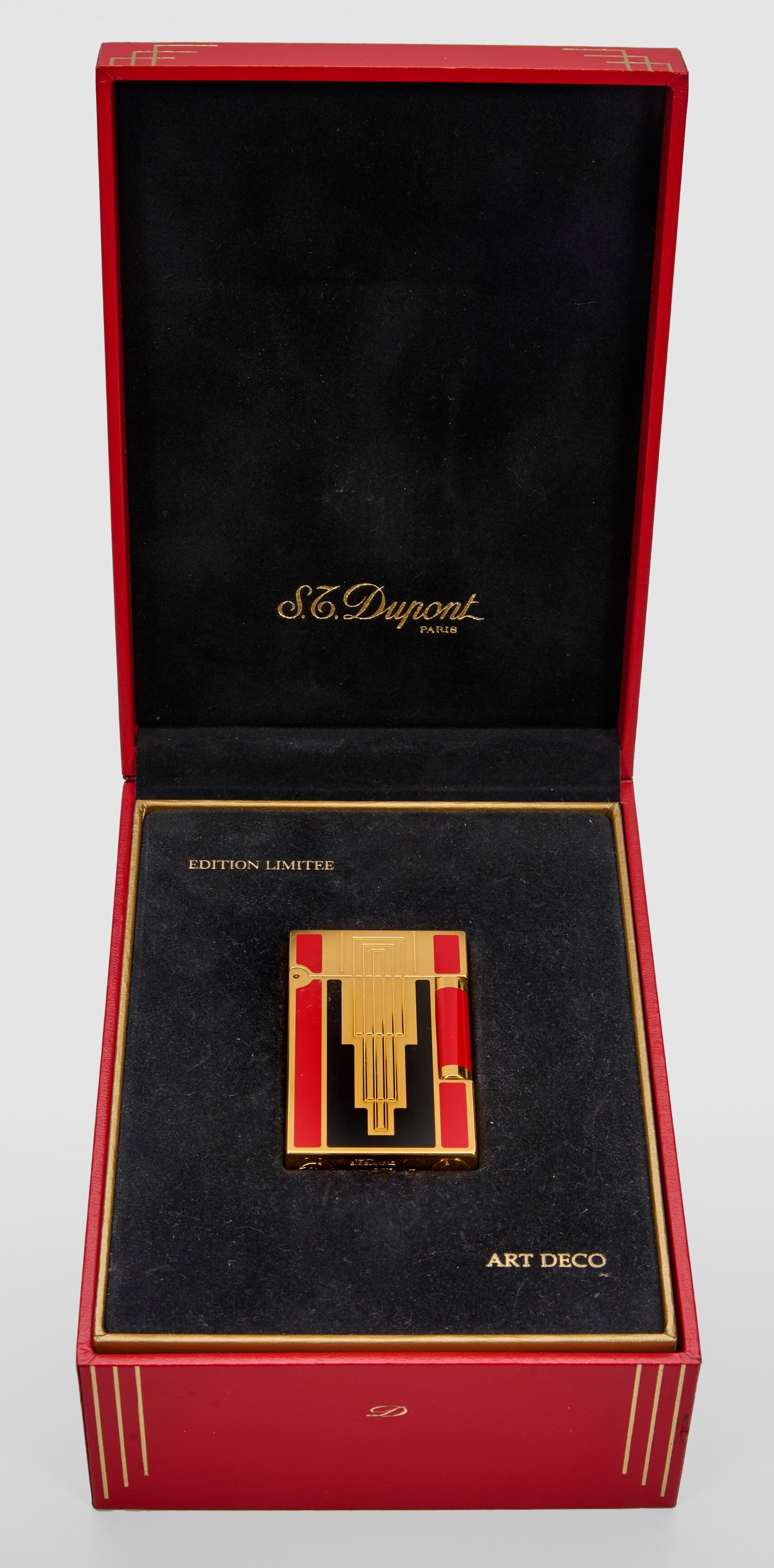 Metall vergoldet, partiell mit rotem und schwarzem China-Lack. Hochrechteckiger Korpus, vorder- und rücks. mit geometrischem Dekor in Guilloche-Technik im Stil des Art Déco. Herstellerzeichen. Limitierte Auflage 1932/2500. Garantiekarte, Originalbox und -Papiere. L. 6,2 cm