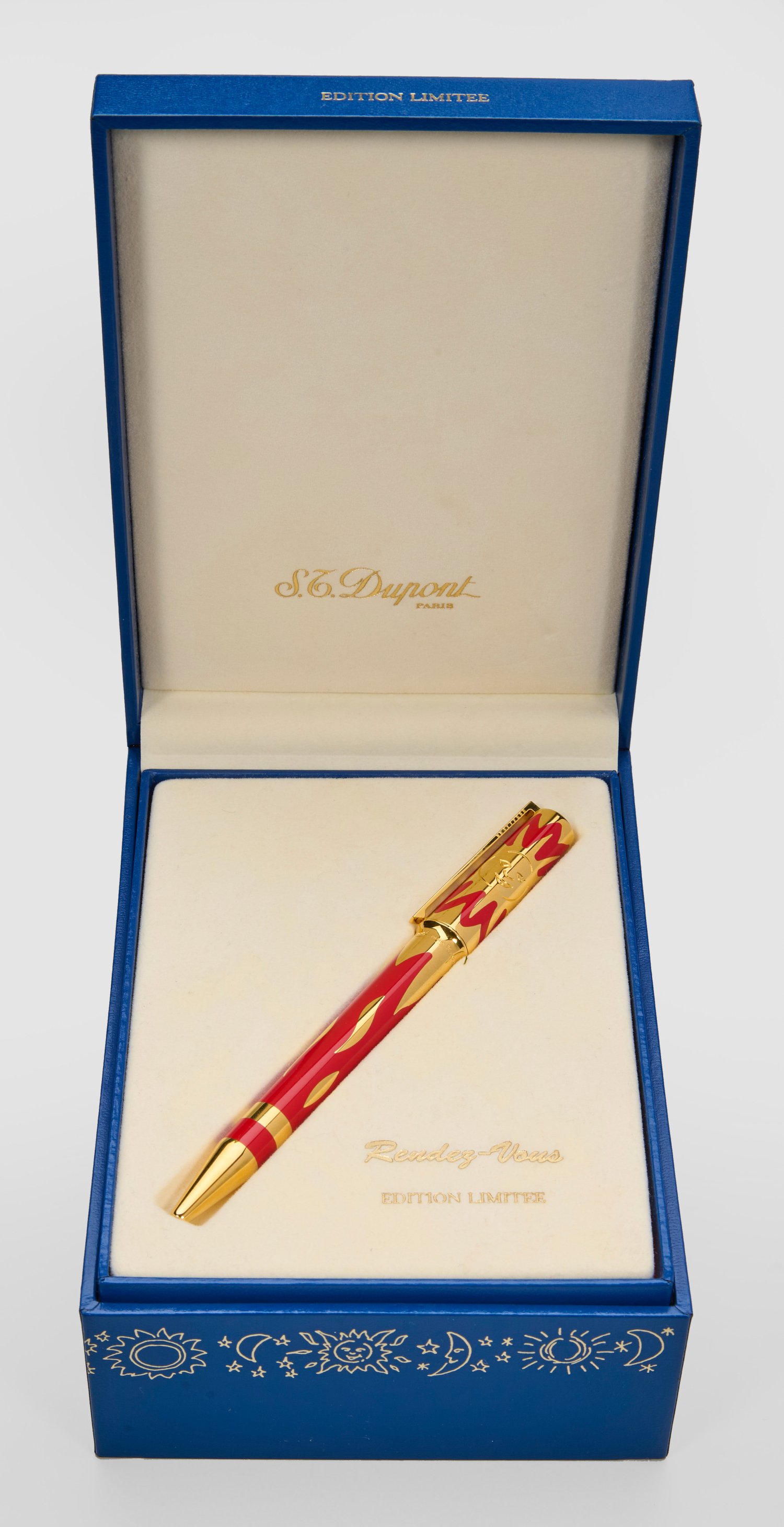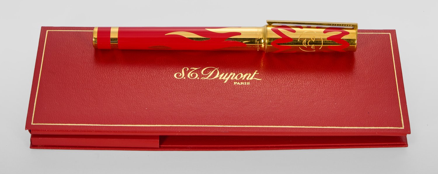 Metall vergoldet und roter China-Lack. Runde Form mit Clip, Feder 18 k Gelbgold, dekoriert mit Sonnen- und Flammenmotiv. Limitierte Auflage 0251/2000 und 0417/2000. Ersatzminen. Herstellerzeichen. Originalbox und -Papiere. L. 13,6/14 cm.