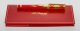 A Vintage Dupont set of gilt metal red Chinese lacquer fountain pen and ballpoint pen, 18 k gold nib, with refills. Manufacturer's mark. One original box and papers.