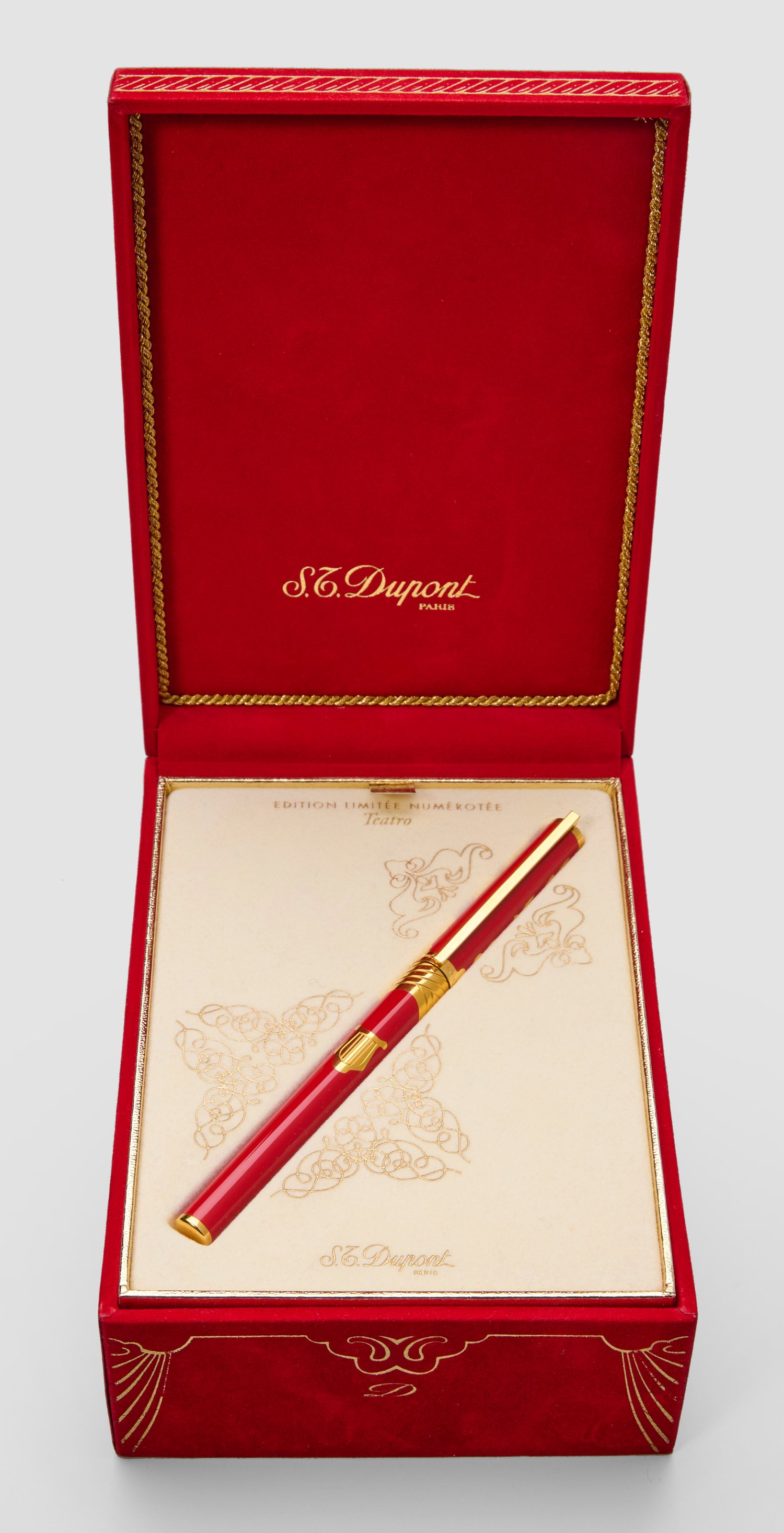 Metall vergoldet, partiell mit rotem China-Lack. Schlanke, runde Form, abnehmbare Kappe mit Clip. Kappe mit Rokoko-Ornament, Schaft vorderseitig mit Lyra-, rücks. mit Theatermaskenmotiv in Cloisonné-Technik. Limitierte Auflage 0301/1000. 3 Ersatzminen. Herstellerzeichen.Garantiekarte, Originalbox und -Papiere. L. 14 cm.