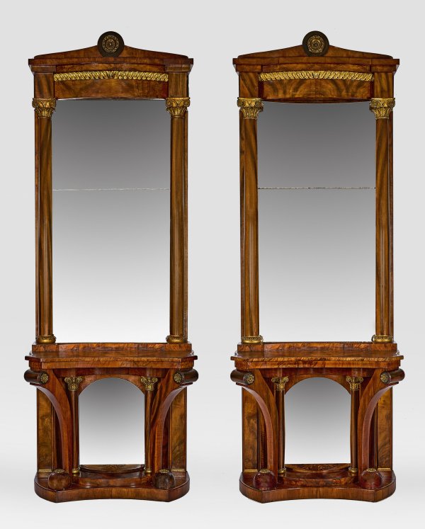 Nussbaum und karelische Birke, furniert mit Einlagen aus unterschiedlichen Hölzern sowie Holz, geschnitzt, gefasst und vergoldet. Über konkav eingezogener, gestuft ansteigender Sockelplatte verspiegelte Rückwand sowie weit zurückgesetzte Vollsäulen und sich konisch verbreiternde Volutenstreben als Träger für korrespondierende Zarge und gering überstehende Deckplatte. Hoher, aufgestellter Spiegelaufsatz aus gerader Rahmung, flankiert von eingestellten Dreiviertelsäulen mit ionischen Kapitellen. Oberhalb bombiertes Gesims mit plastisch gearbeitetem Eichblattfries sowie gestuft ansteigendem Gesims mit zentraler Bekrönung aus einem Tondo mit applizierter Reliefrosette aus Messing. Zweigeteiltes Spiegelglas. Ges.-H. 274 cm. 99 cm x 45 cm.