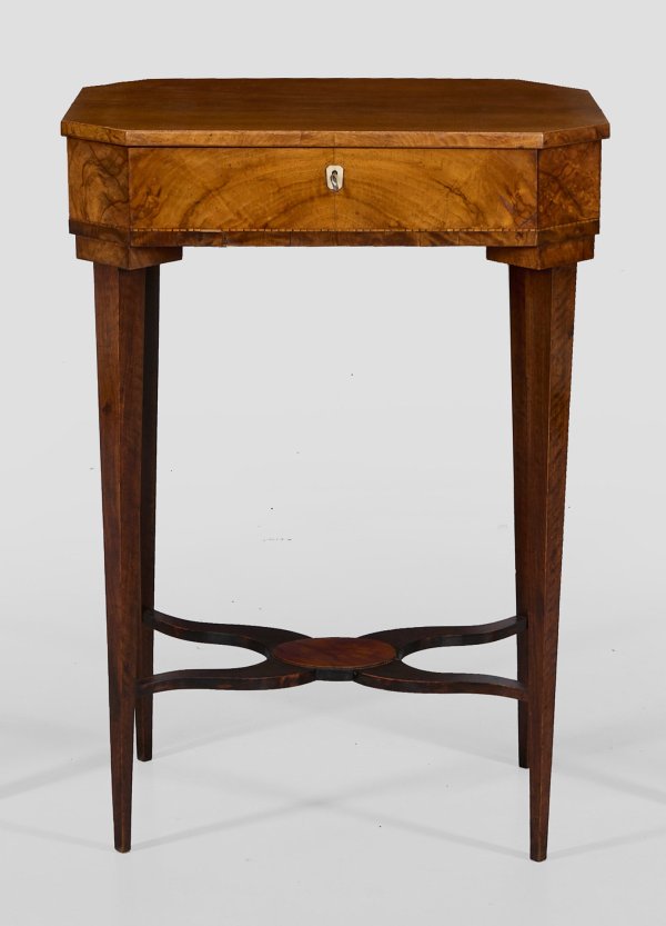 Nussbaum, furniert. Gerader, rechteckiger Zargenkasten mit breit angeschrägten Ecken auf hohen, konischen Vierkantbeinen, durch geschweifte Stege verbunden. Gering überstehende, aufklappbare Deckplatte. Unterhalb gestaffelte Facheinteilung. Schlüsselschild und Knäufe aus Knochen. H. 78 cm. 58 cm x 37,5 cm.