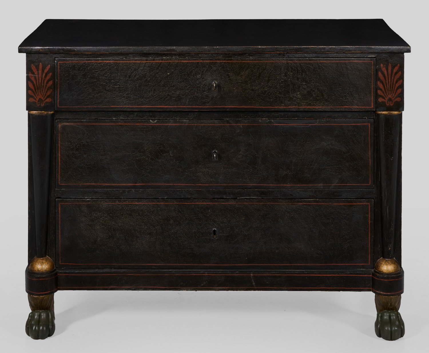 Holz, schwarz gefasst und teilw. vergoldet. Gerader, querrechteckig angelegter Korpus, flankiert von eingestellten Halbsäulen auf plastisch gestalteten Tatzenfüßen. In der gegliederten Front drei breite, teilw. vorkragende Schubladen unterschiedlicher Größe. Gering überstehende Deckplatte. Rest.; H. 83 cm. 111 cm x 52,5 cm.