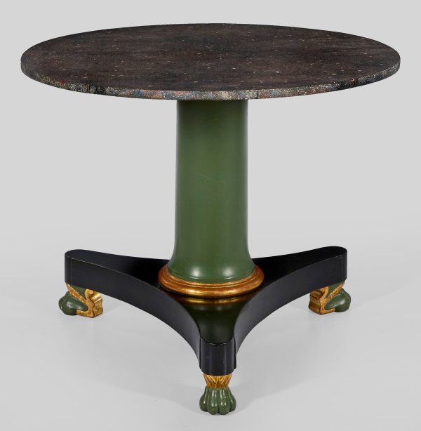 Holz, schwarz und moosgrün gefasst sowie teilw. vergoldet. Über dreiseitig konkav eingezogener Sockelplatte auf plastischen Tatzenfüßen kräftiger, leicht konischer Rundschaft als Träger für runde, abklappbare Deckplatte mit flächendeckendem, illusionistisch gestaltetem Dekor in anthrazitfarbener Marmoroptik. Rest.; H. 78 cm. D. 95 cm.