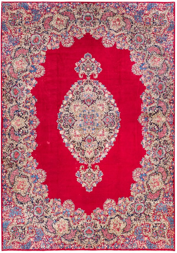Persien. Mitte 20. Jh.; Wolle auf Baumwolle. Im passig geschweiften, monochrom roten Innenfeld großes gestrecktes Zentralmedaillon mit Anhängern sowie dichter Blütenmusterung. Umlaufend korrespondierende Bordüre aus dichten Blütenrispen. 387 cm x 271 cm.