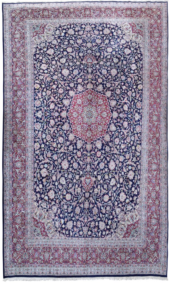 Persien. Wolle auf Baumwolle. Im dunkelblauen Innenfeld rotes Zentralmedaillon sowie kleine, passig geschweifte Ecklösungen. Flächendeckende Musterung aus üppigen Palmettenranken. Umlaufend breite, korrespondierende, rotgrundige Bordüre, flankiert von schmalen Bändern. Sign.; 600 cm x 400 cm.