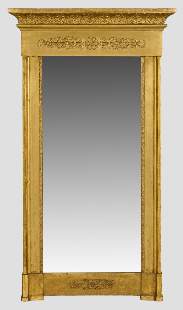 Holz, stuckiert, gefasst und vergoldet. Gerade, hochrechteckige Spiegelrahmung, seitlich mit schmalem Palmettenfries. Breites Giebelfeld mit zentraler Rosette, flankiert von ornamental angeordnetem Blattwerk. Oberhalb gekehltes Gesims mit Palmettenfries. Rücks. Papieretikett. 129 cm x 73 cm.