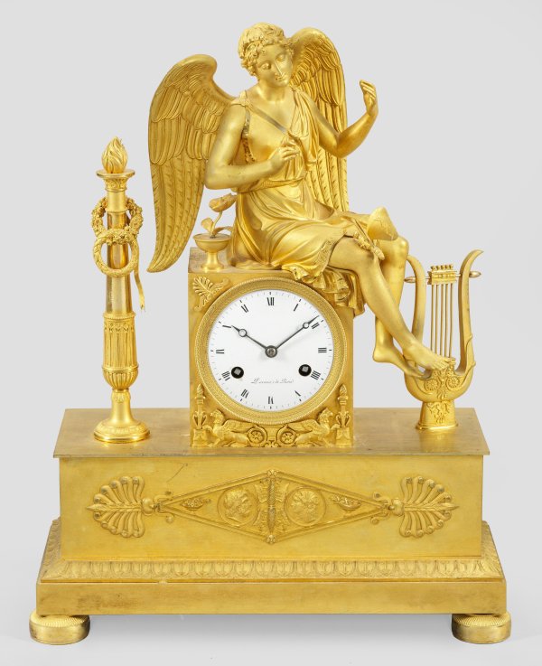 Bronze, feuervergoldet. Vollplastische Darstellung Amors mit einem Schmetterling auf seinem Knie, als Anspielung auf seine Geliebte Psyche auf dem rechteckigen Uhrenkorpus sitzend. Profilgerahmtes, weißes, minim. besch. Emailzifferblatt bez. Decaux à Paris. Pendulenwerk mit Fadenaufhängung sowie Halbstundenschlag auf Glocke. Unterhalb querrechteckig angelegter Sockel mit Palmettenfries auf gedrückten Füßen. H. 41,5 cm. 32 cm x 13 cm.