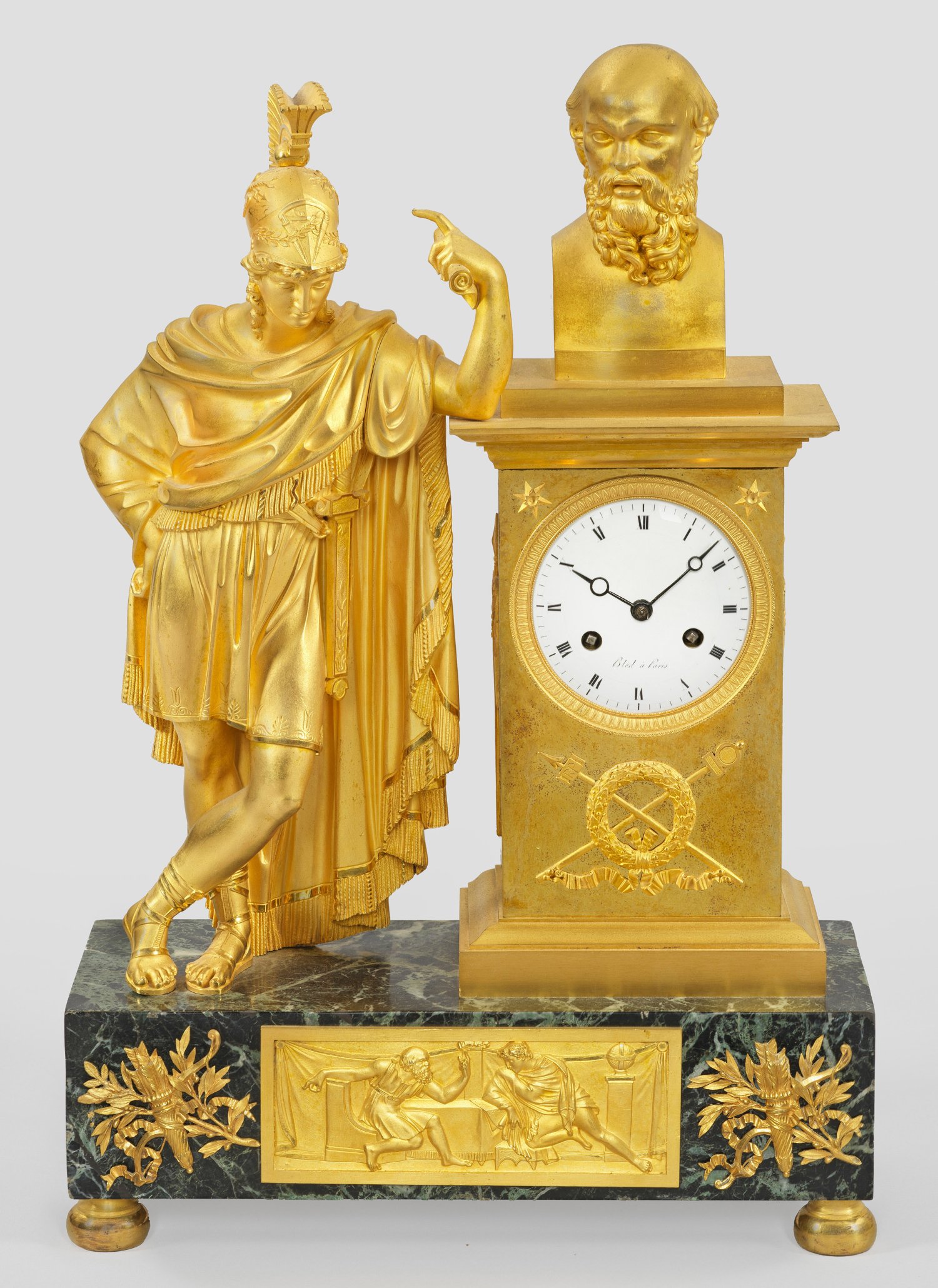 Bronze, feuervergoldet sowie in unterschiedlichen Grüntönen gemaserter Marmor. Vollplastische Darstellung des Athener Feldherrn und Staatsmannes Alcibiades, in seiner Rede auf das hochrechteckige Uhrengehäuse mit großer Büste des Sokrates gestützt. Unterhalb querrechteckig angelegter Sockel mit korrespondierendem Figurenfries, flankiert von erhaben reliefierten Köchern und Lorbeerblatt. Weißes Emailzifferblatt bez. Bled à Paris. Pendulenwerk mit Fadenaufhängung und Halbstundenschlag auf Glocke. H. 50 cm. 32,5 cm x 13,5 cm.
